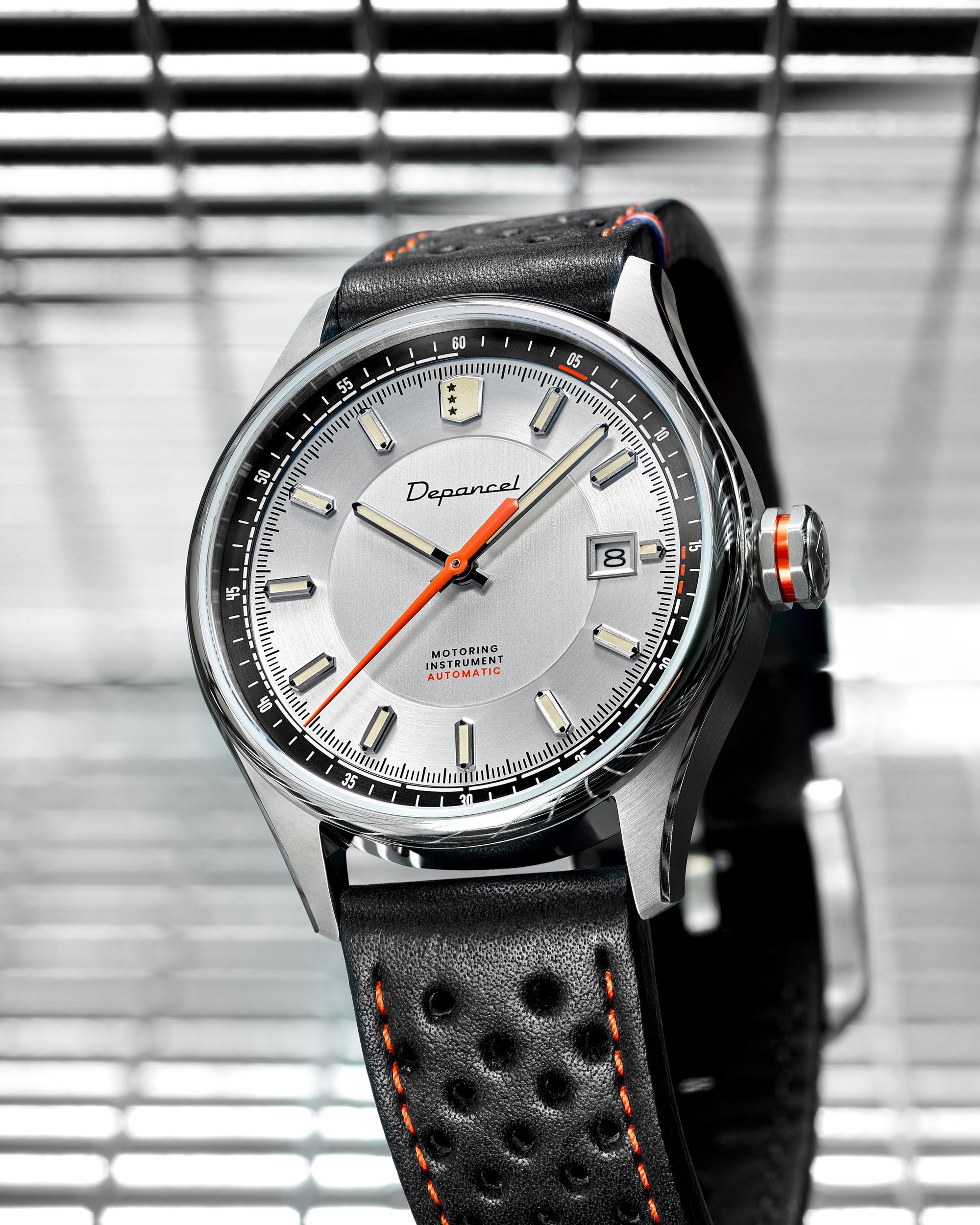 The Autosport Date case features a 39mm stainless steel case with pure lines and meticulous finishes. Its polished bezel contrasts subtly with the circular brushing of the lugs, while the sides feature horizontal brushing and polished upper edges. The watch is adorned with a sapphire crystal offering durability and resistance to wear over time.