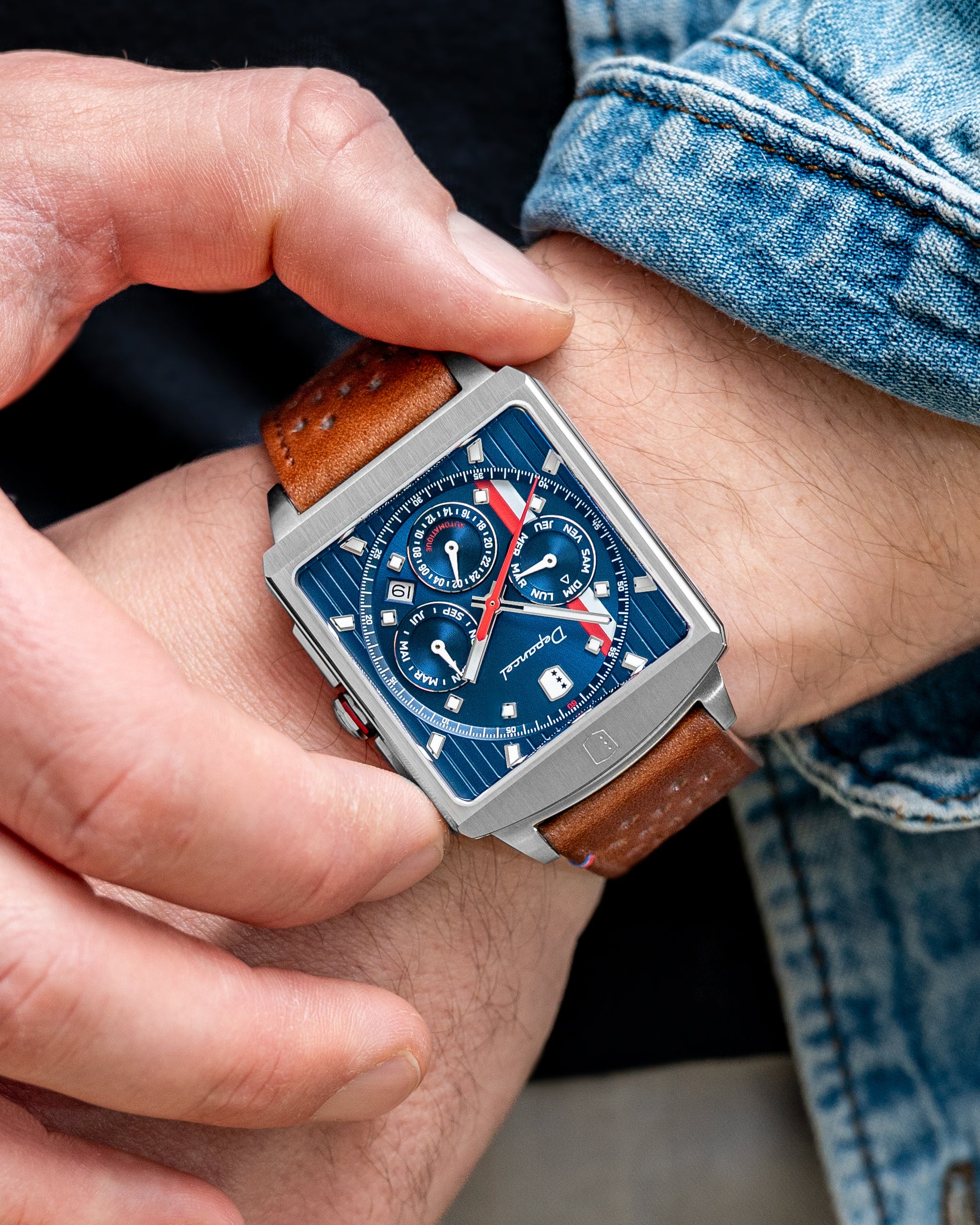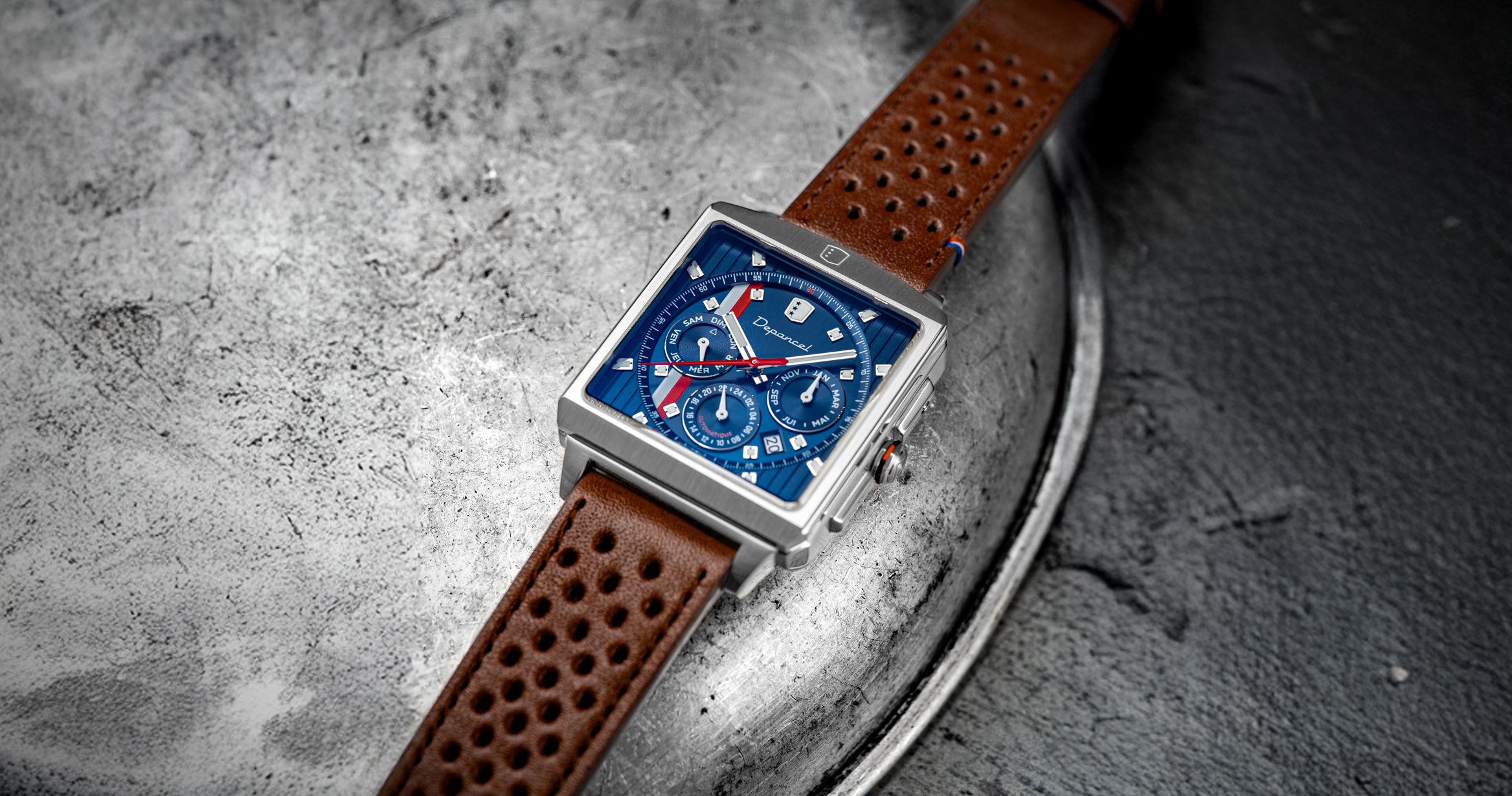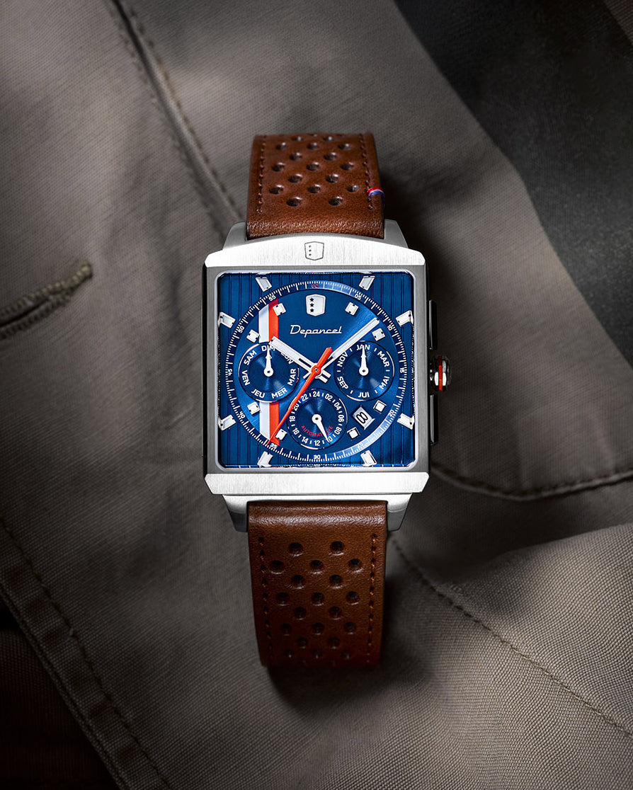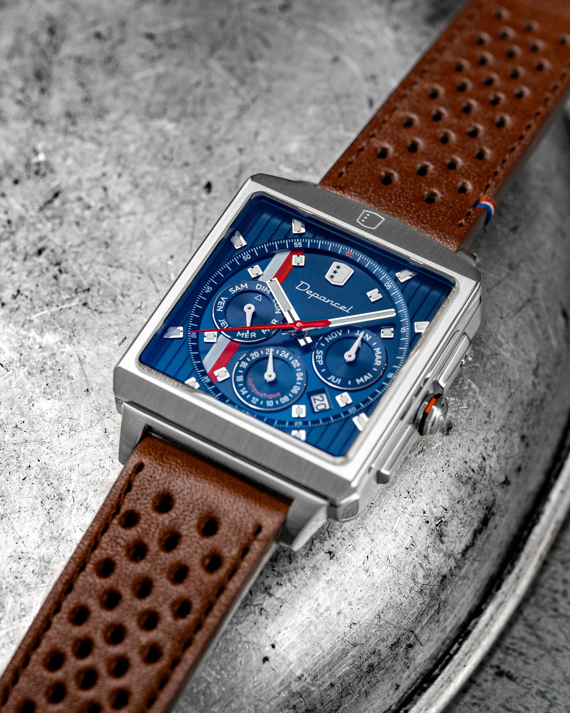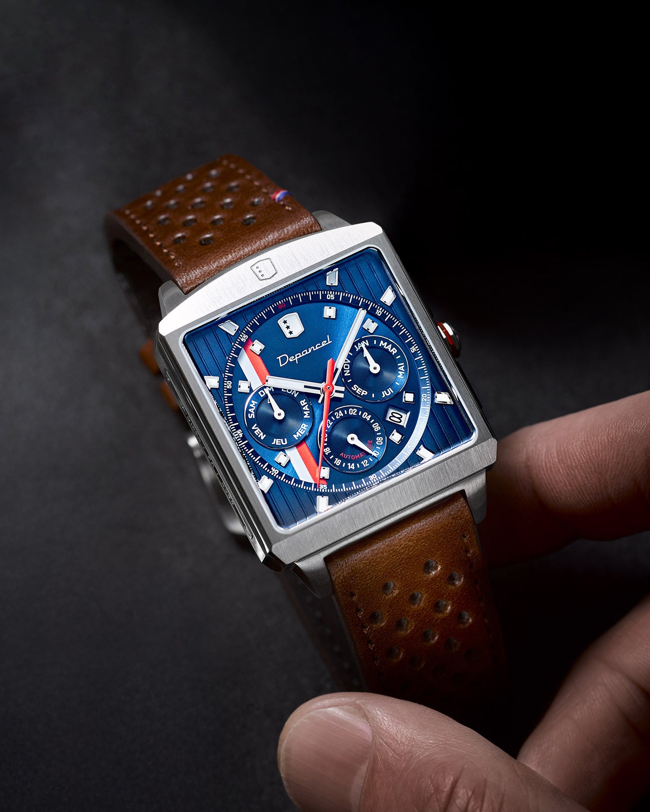 The dial of the Série R01 captures the richness of our world, featuring a two-level design with bold vertical lines reminiscent of vintage racing car air vents. The “Depancel Dashboard” hands, inspired by dashboard gauges, and the track-like indexes are coated with Super-LumiNova® C1 to ensure perfect readability in all conditions.