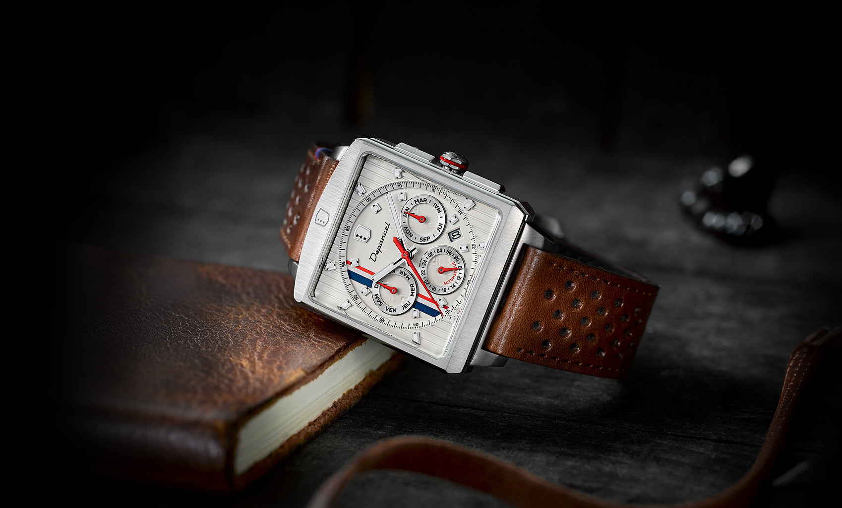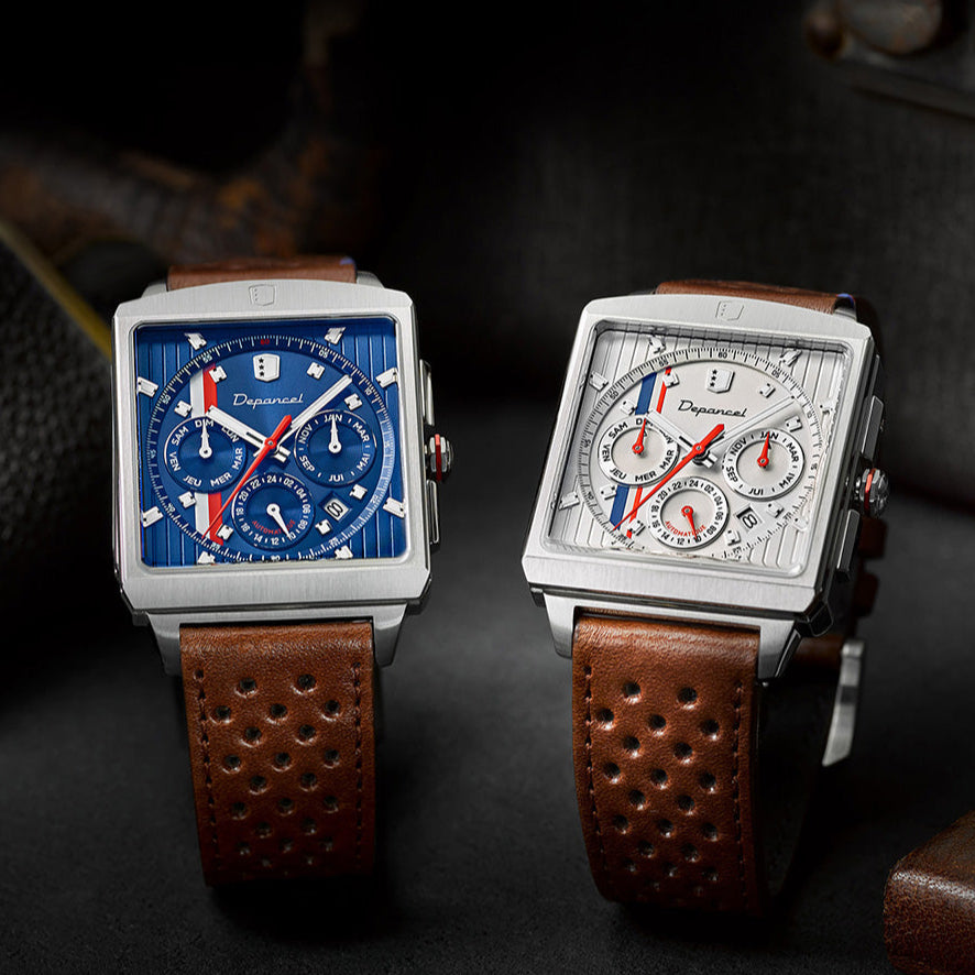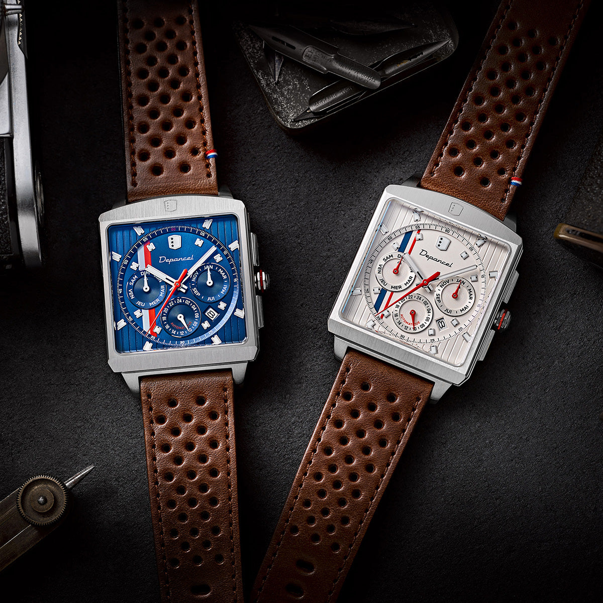 The dial of the Série R01 captures the richness of our world, featuring a two-level design with bold vertical lines reminiscent of vintage racing car air vents. The “Depancel Dashboard” hands, inspired by dashboard gauges, and the track-like indexes are coated with Super-LumiNova® C1 to ensure perfect readability in all conditions.