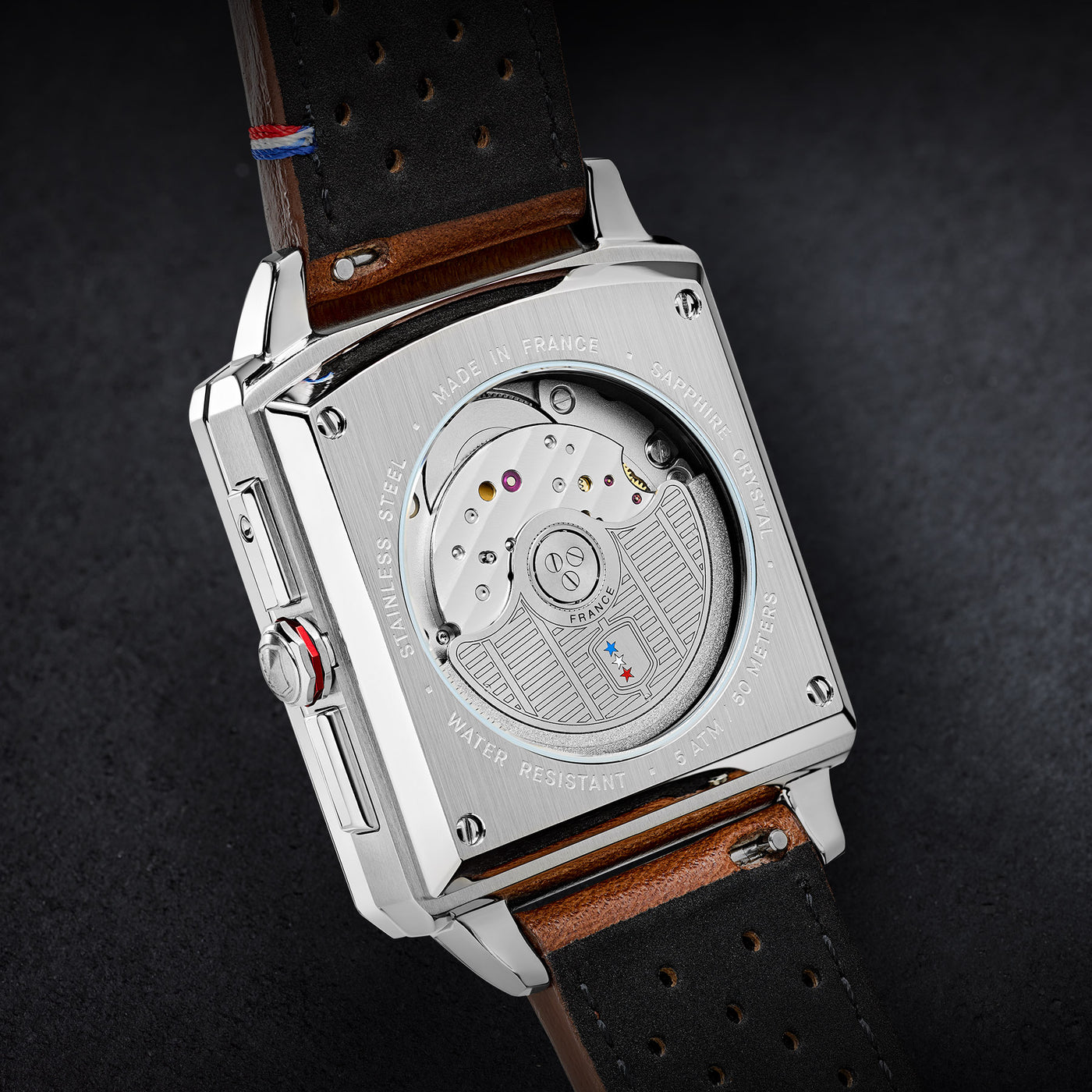 With its distinctive square design, inspired by the grilles of classic sports cars, the Série R01 features a 43×36mm stainless steel case with dynamic edges, bevelled at 6 and 12 o’clock for optimal ergonomics and a natural fit on the wrist. The top of the case displays a vertical brushed finish, while the case sides alternate between horizontal brushing and polished surfaces for a refined contrast. The entire silhouette is topped with a bevelled sapphire glass that extends the lines of the case with seamless elegance.