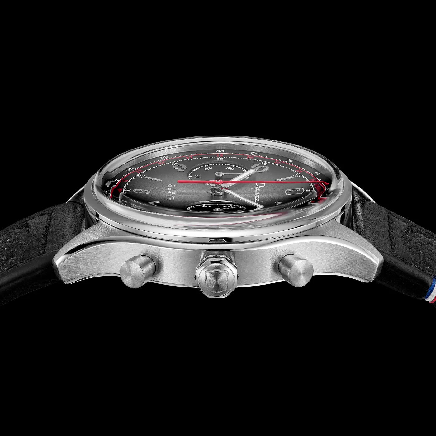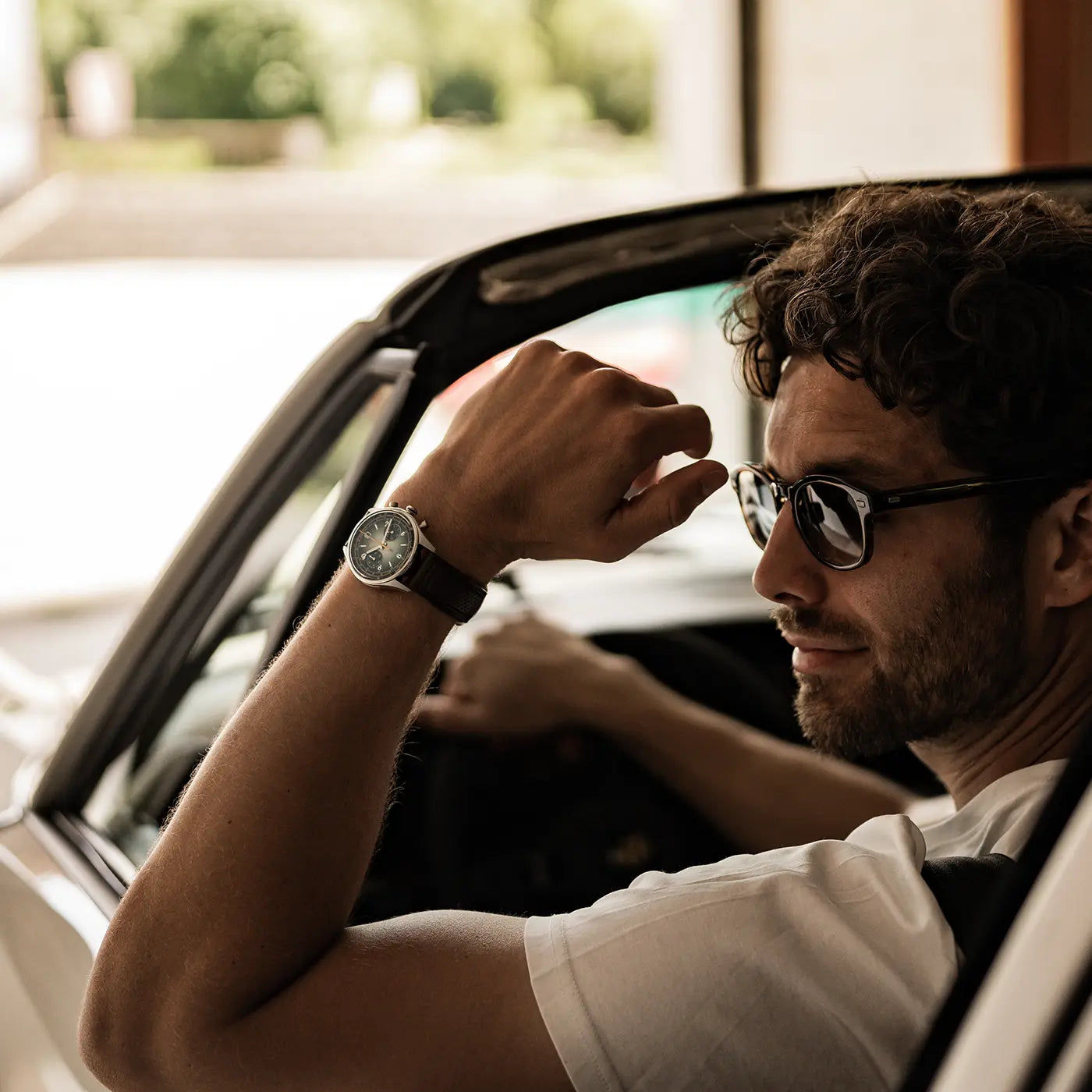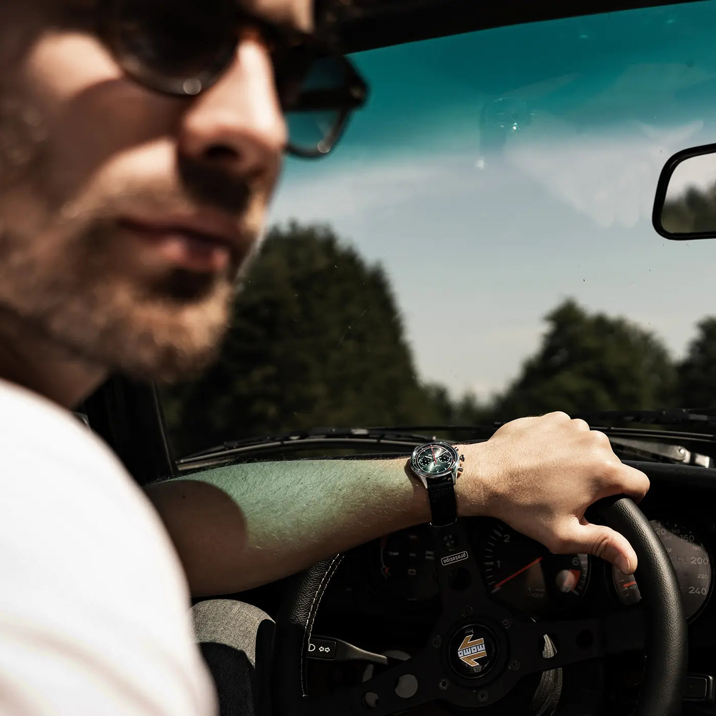 We designed this watch as an essential piece for classic car lovers, so you’ll love the crown that resembles a radiator cap and the ultra-vintage, minimalist mushroom pushers.