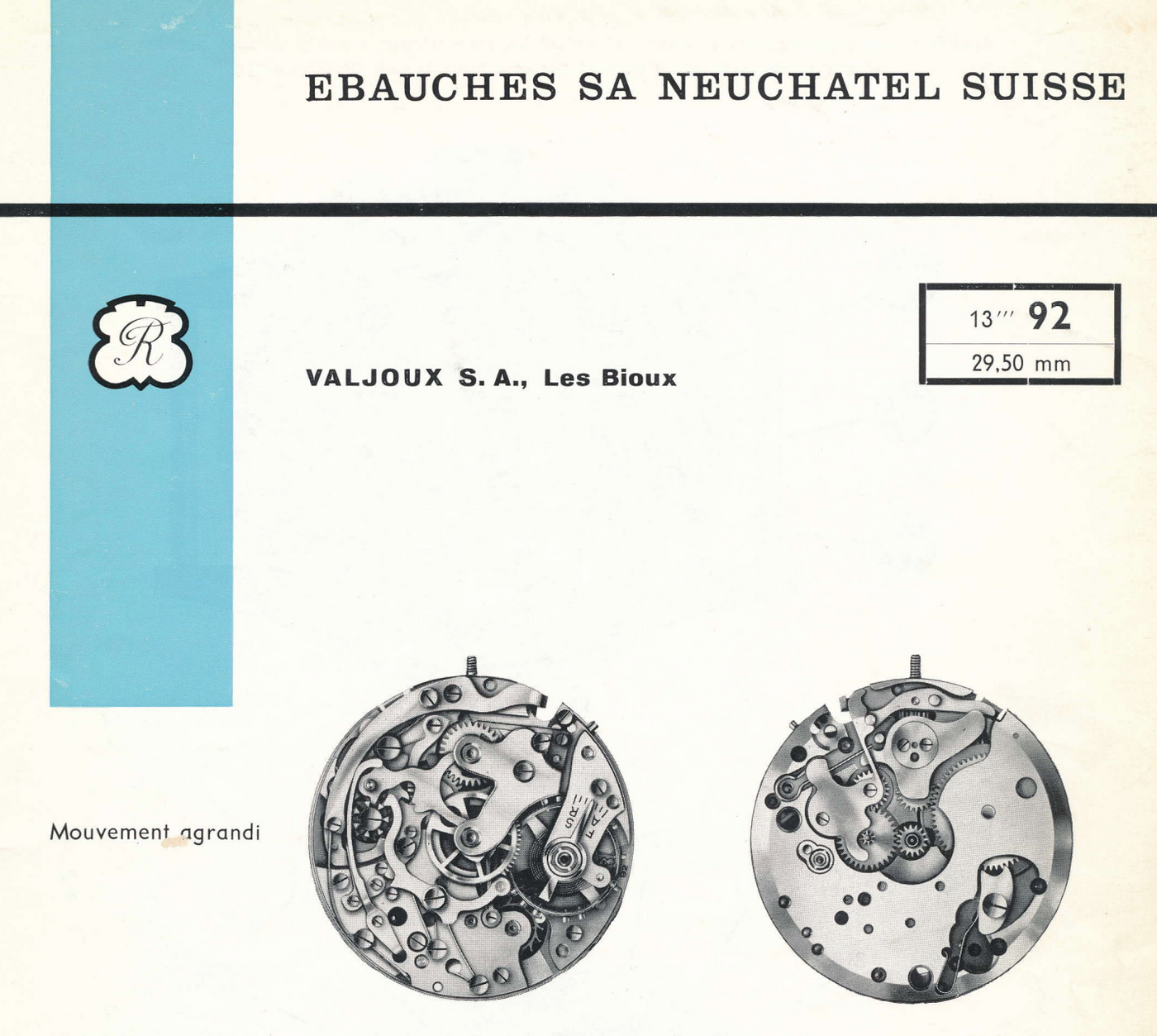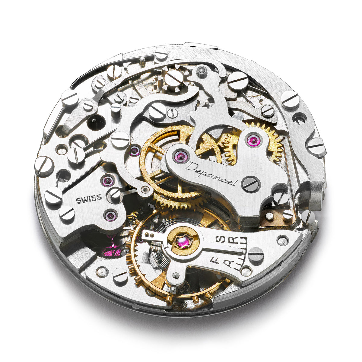 Born and manufactured in Switzerland in the 50s and 60s, the Valjoux 92 incorporated the technological innovation of the famous oscillating pinion, enabling the chronograph to operate much more efficiently thanks to a coupling system linking the chronograph part to the watch part of the movement with extreme precision, and became a benchmark among manual chronograph movements of the era.