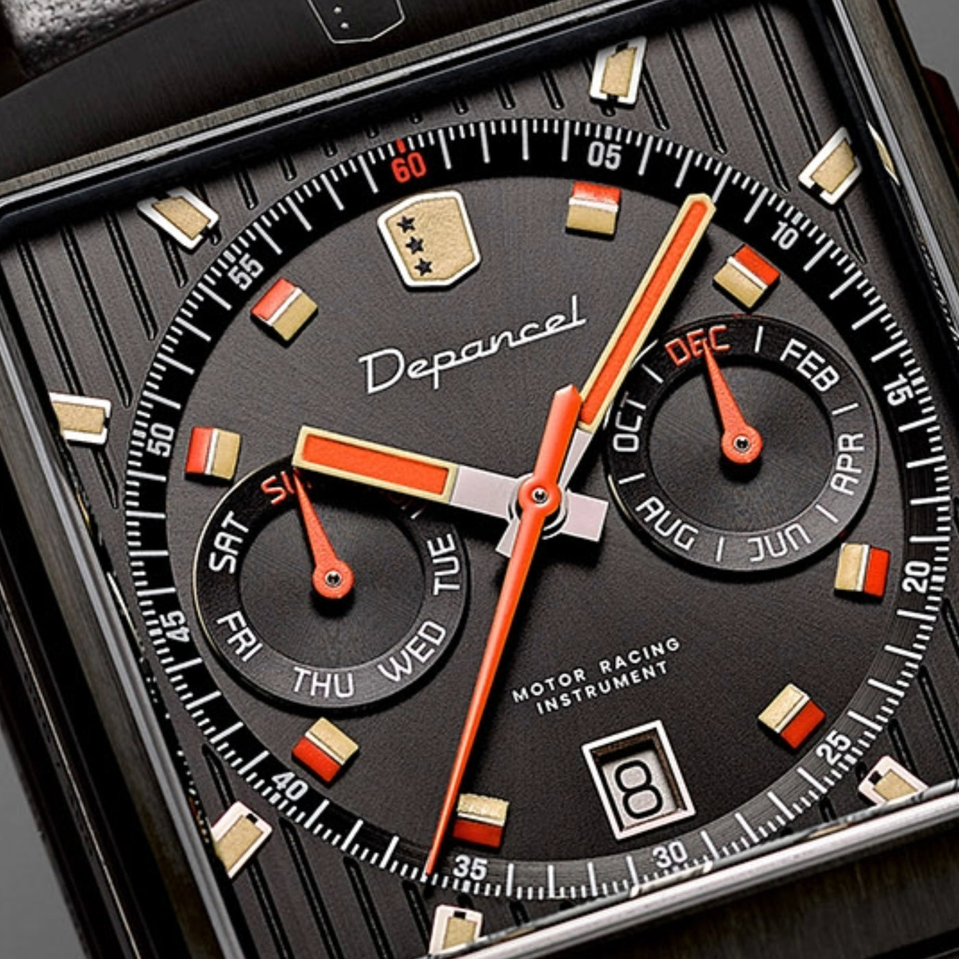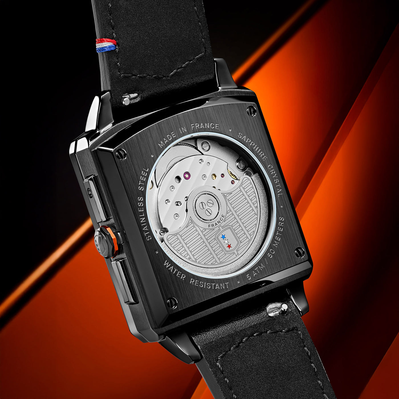 The square dial of the Série-R Full Black is distinguished by its triple calendar complication, offering a fluid and elegant reading of the date, day and month. The rhodium-plated and polished orange and SLN applied hour markers add a touch of refinement, while the black counters and flat-finish hands underline its sporty, vintage character. The whole is enhanced by an orange and old radium tint, creating a subtle contrast that evokes a retro aesthetic while guaranteeing optimal visibility in all light conditions. The square dial perfectly combines functionality and style, making the Série-R Full Black a watch with a bold, timeless design.