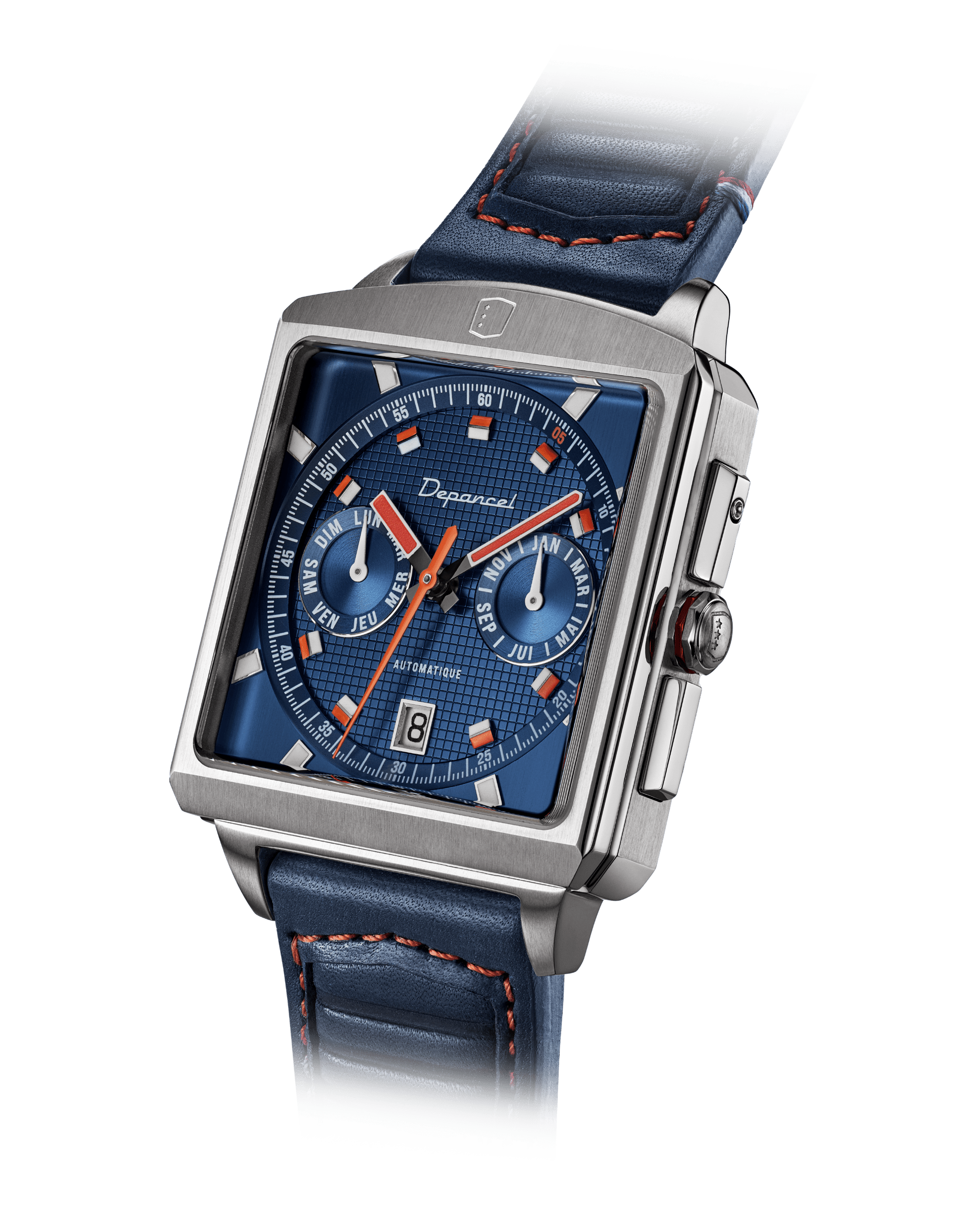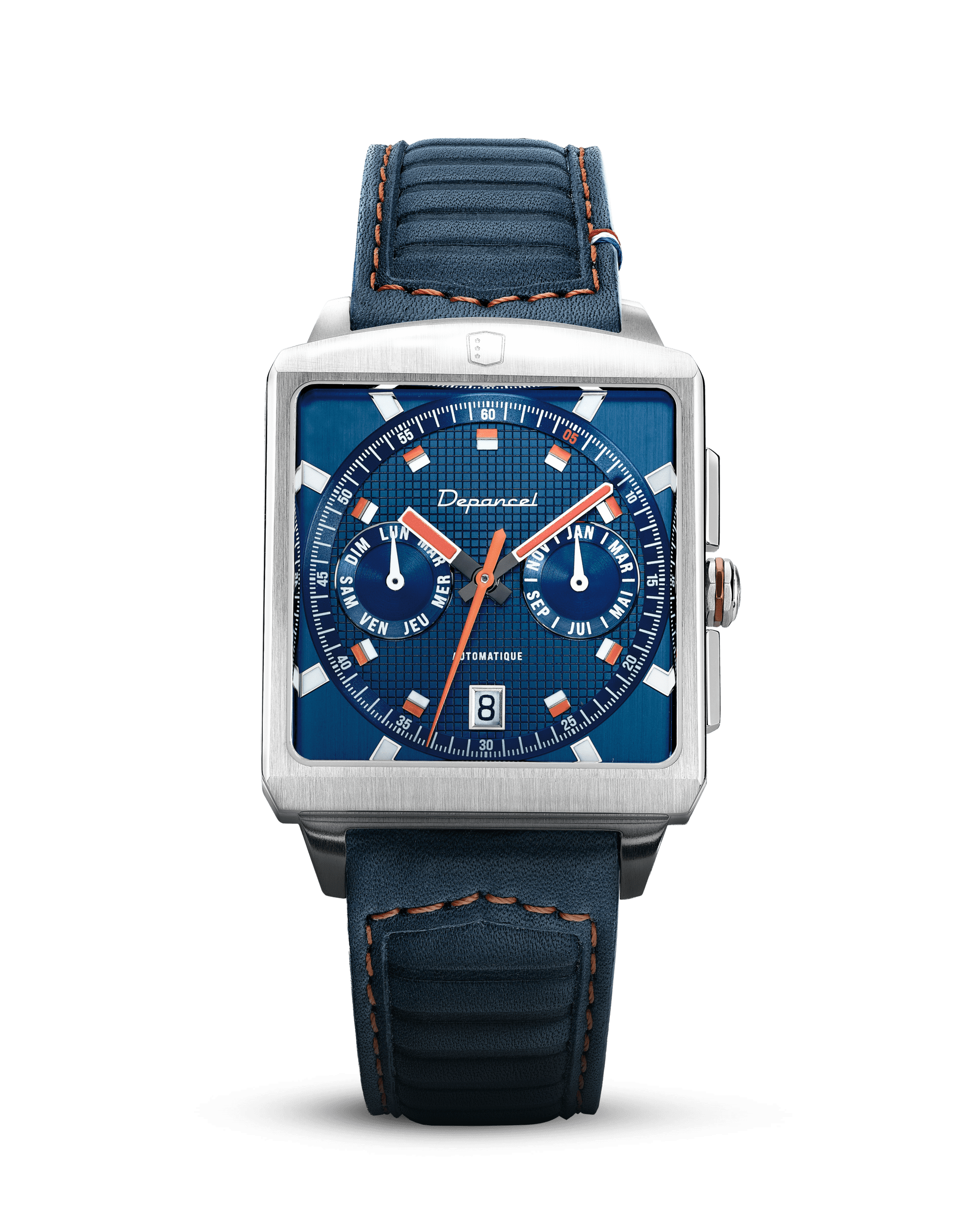 Avec ce nouveau cadran bleu métallique brossé rehaussé par les détails orange des aiguilles, des indexes et des coutures du bracelet, Depancel réaffirme sa passion pour l’automobile. Indexes appliques polis, colorés et luminescents, fine texture de grille de radiateur au centre, clin d'œil aux 5 ans dans la minuterie : chaque détail a été pensé avec soin, pour une édition anniversaire qui sera disponible en seulement 300 pièces numérotées.