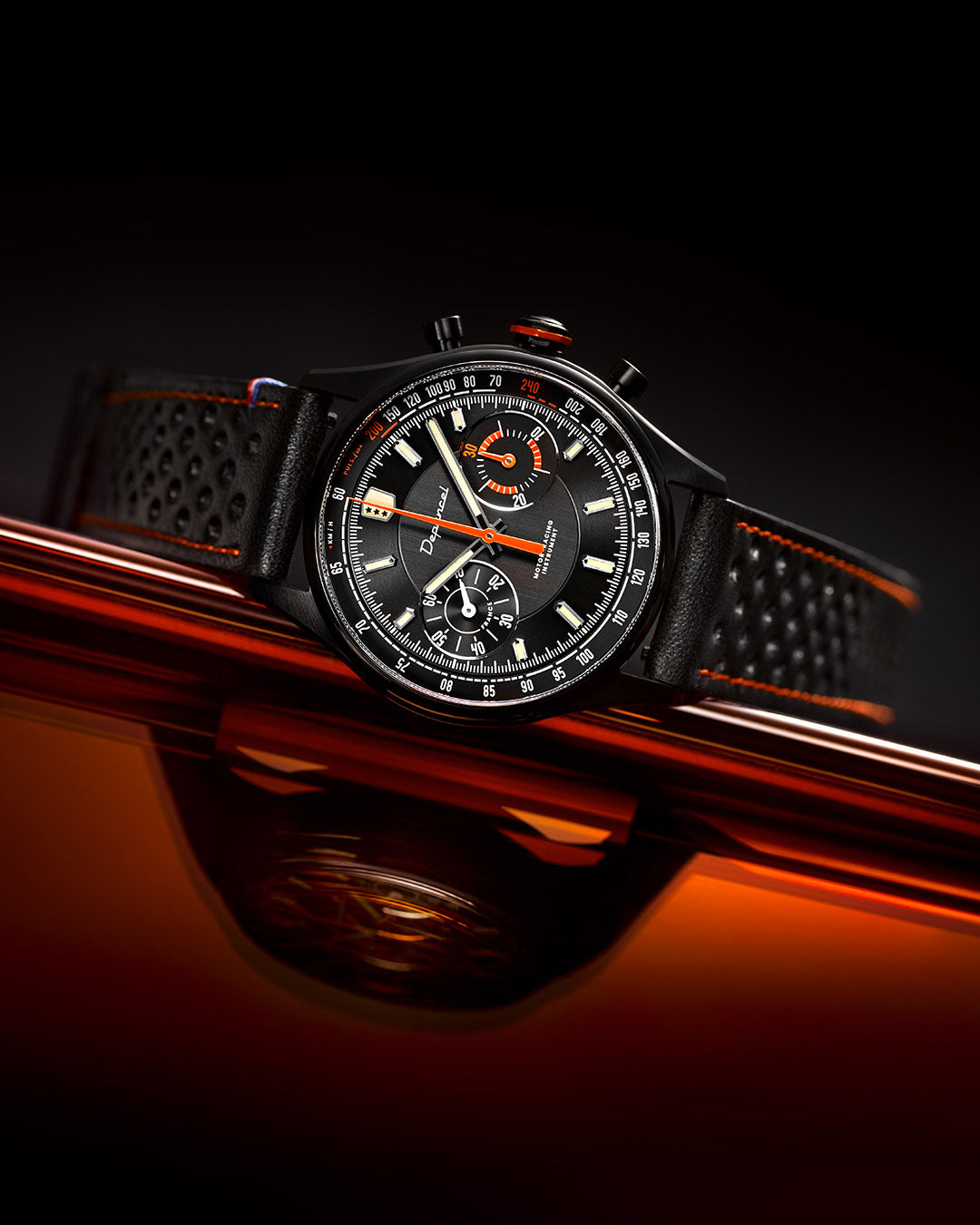 Ce chronographe, pensé pour les pilotes et les amoureux des sports mécaniques se présente dans un boîtier en acier inoxydable de 39mm de diamètre Une dimension pleine de sens, puisqu’elle évoque parfaitement l’esprit des chronos sportifs adoptés par les pilotes dans les années 60 et 70. Tout y est affaire de détails. En observant le cadran, il devient évident que chaque attribut a été pensé pour illustrer la philosophie de cette pièce sportive évoquant l’âge d’or de la compétition. Une époque d’audace et d’insouciance, de créativité, de découvertes et d’expérimentation. L’automobile était porteuse de liberté. Face au danger, les pilotes faisaient preuve d’une belle dose de courage. Comme l’a si bien résumé Jackie Stewart, l’un des plus grands pilotes de F1: « C'était une époque où le sexe était sûr et la course automobile dangereuse. »