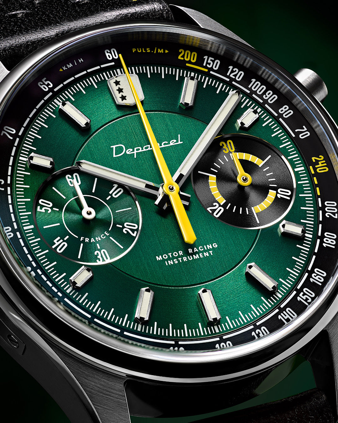 Pour permettre une lisibilité instantanée des indications, notamment lorsque l’on conduit, les sous-compteurs sont de différentes couleurs, homogènes avec les coloris du cadran tout en jouant sur les effets de contrastes. Idéalement placé à trois heures, le compteur des minutes du chronographe est noir avec les indications jaunes, tandis que le compteur de petite seconde à neuf heures est de couleur ‘Vert anglais’ avec les marquages blancs.