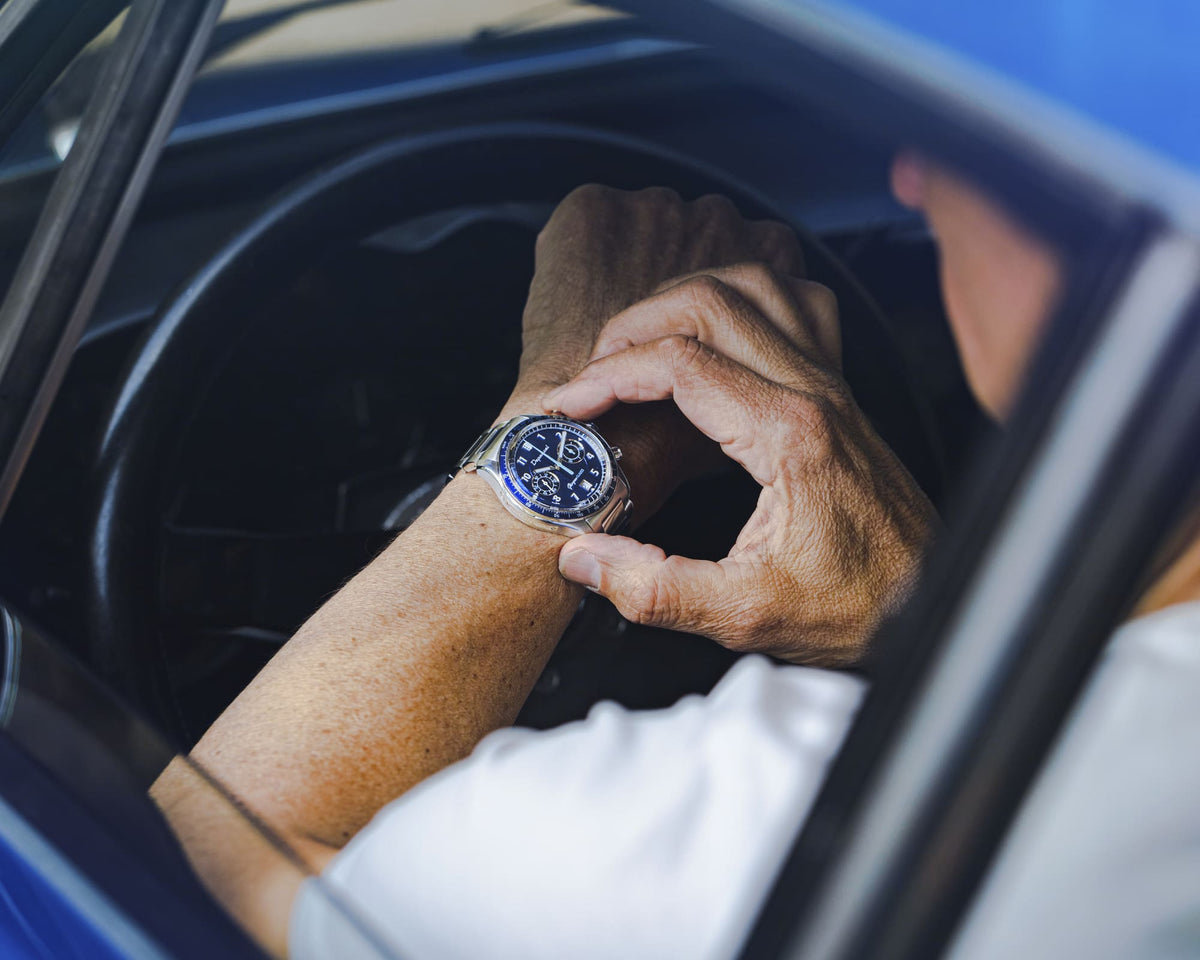 Jürgen a ici injecté les éléments moteurs de sa passion. Sa signature. Le bleu de son modèle fétiche. Les deux poussoirs du chronographe sont cerclés comme deux pistons.