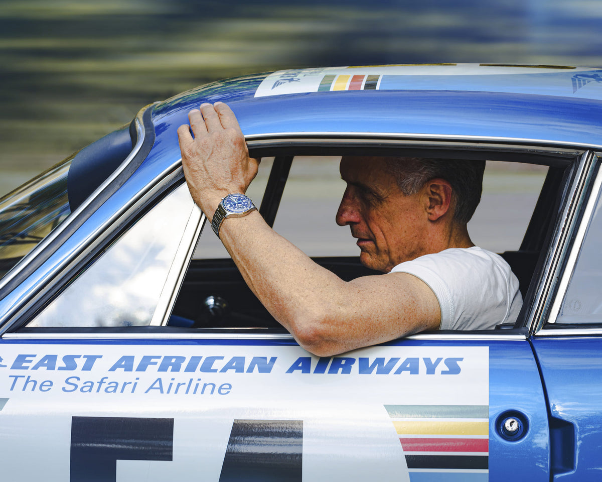 Une trajectoire hors norme saluée par un chronographe Swiss Made, base Valjoux « new old stock » dont chaque détail souligne le caractère racing et racé.