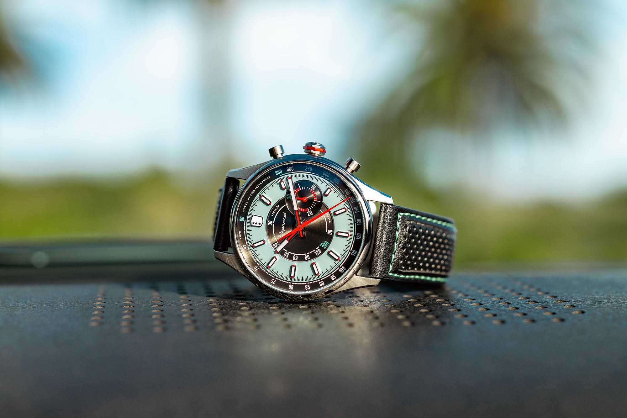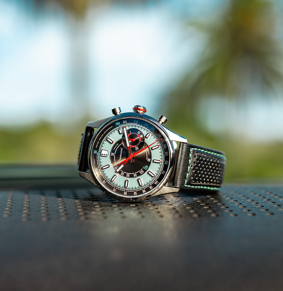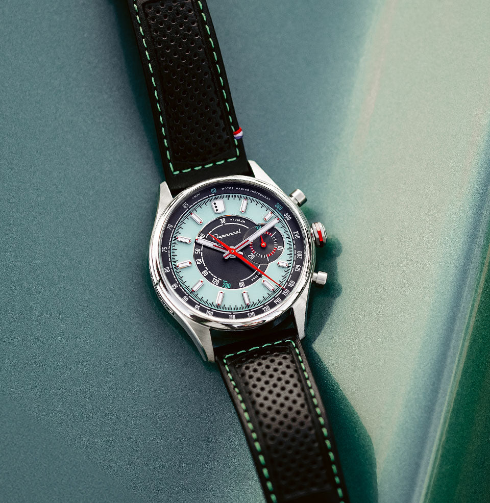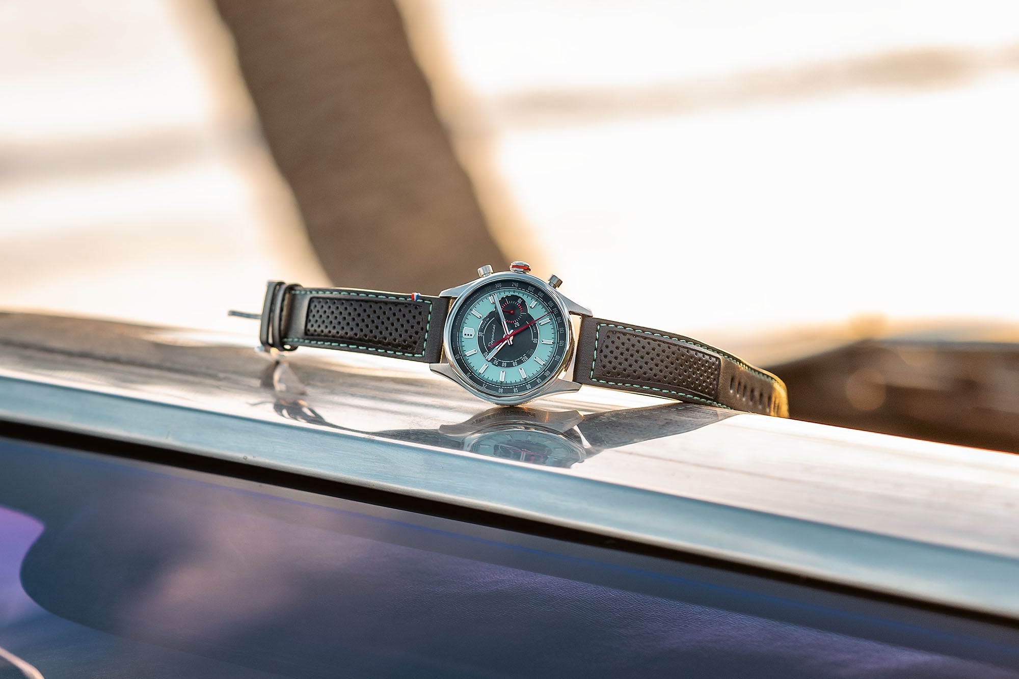L’esthétique est à la fois luxueuse et sportive, avec un look neo-vintage très tendance. A la différence des chronographes traditionnels, le design du cadran, très original, incorpore une échelle pulsométrique en son centre, qui se lit avec l’extrémité arrière de l’aiguille des secondes chrono. Le choix de la couleur menthe comme couleur principale du cadran s’inspire de ces voitures américaines classiques, aux couleurs acidulées présentes dans l’imaginaire californien.