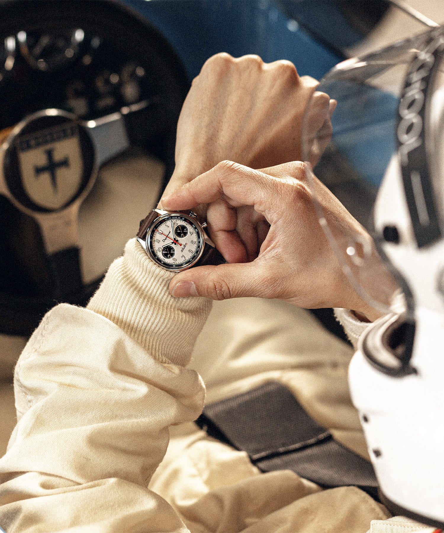 Par souci de fidélité historique, l’habillage de cette collection Legend 60s a été conçu pour restituer l’exacte sensation des chronographes d’époque. Le diamètre a été soigneusement préservé à 39 mm, le standard des années 60. La boîte est en acier, le matériau le plus résistant pour affronter les rigueurs de la F1, et surmontée d'un verre en saphir. Le bracelet est microperforé, un motif que l’on trouvait également sur les gants des pilotes.