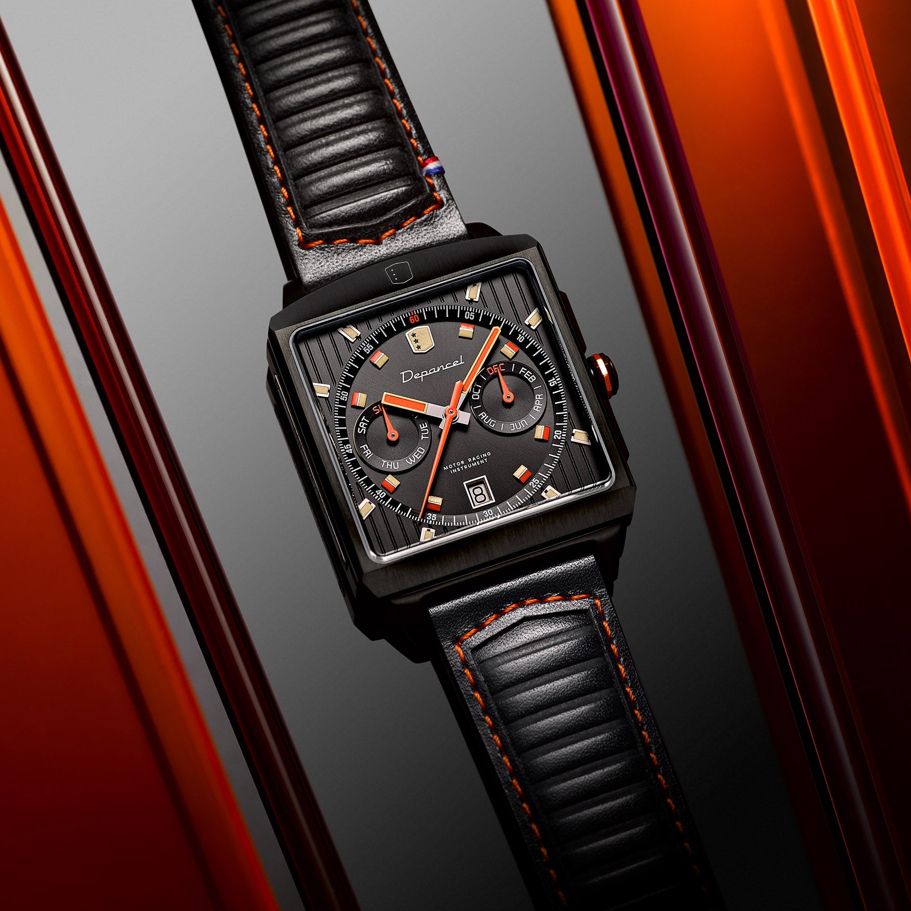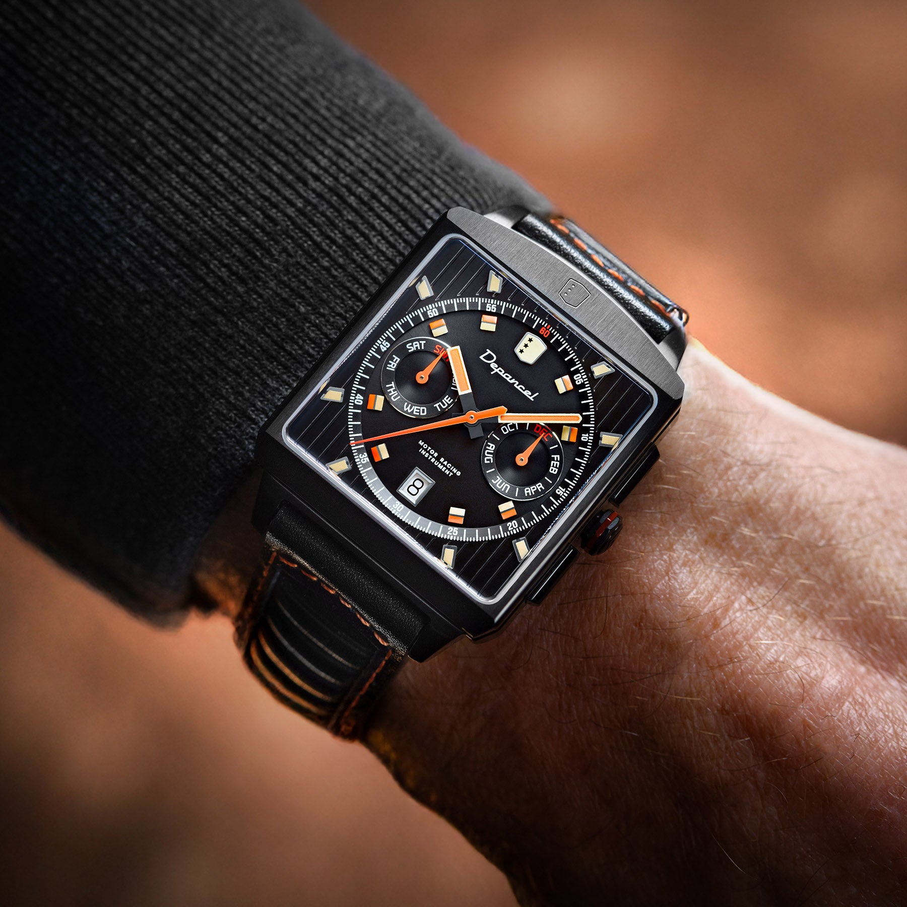 Le cadran carré de la Série-R Full Black se distingue par sa complication triple calendrier, offrant une lecture fluide et élégante de la date, du jour et du mois. Les index appliqués, rhodiés et polis, orange et SLN apportent une touche de raffinement, tandis que les compteurs noirs et les aiguilles, au fini plat, soulignent son caractère sportif et vintage. L'ensemble est rehaussé par une teinte orange et old radium, créant un contraste subtil qui évoque une esthétique rétro tout en garantissant une visibilité optimale dans toutes les conditions de lumière. Ce cadran carré allie parfaitement fonctionnalité et style, faisant de la Série-R Full Black une montre au design audacieux et intemporel.