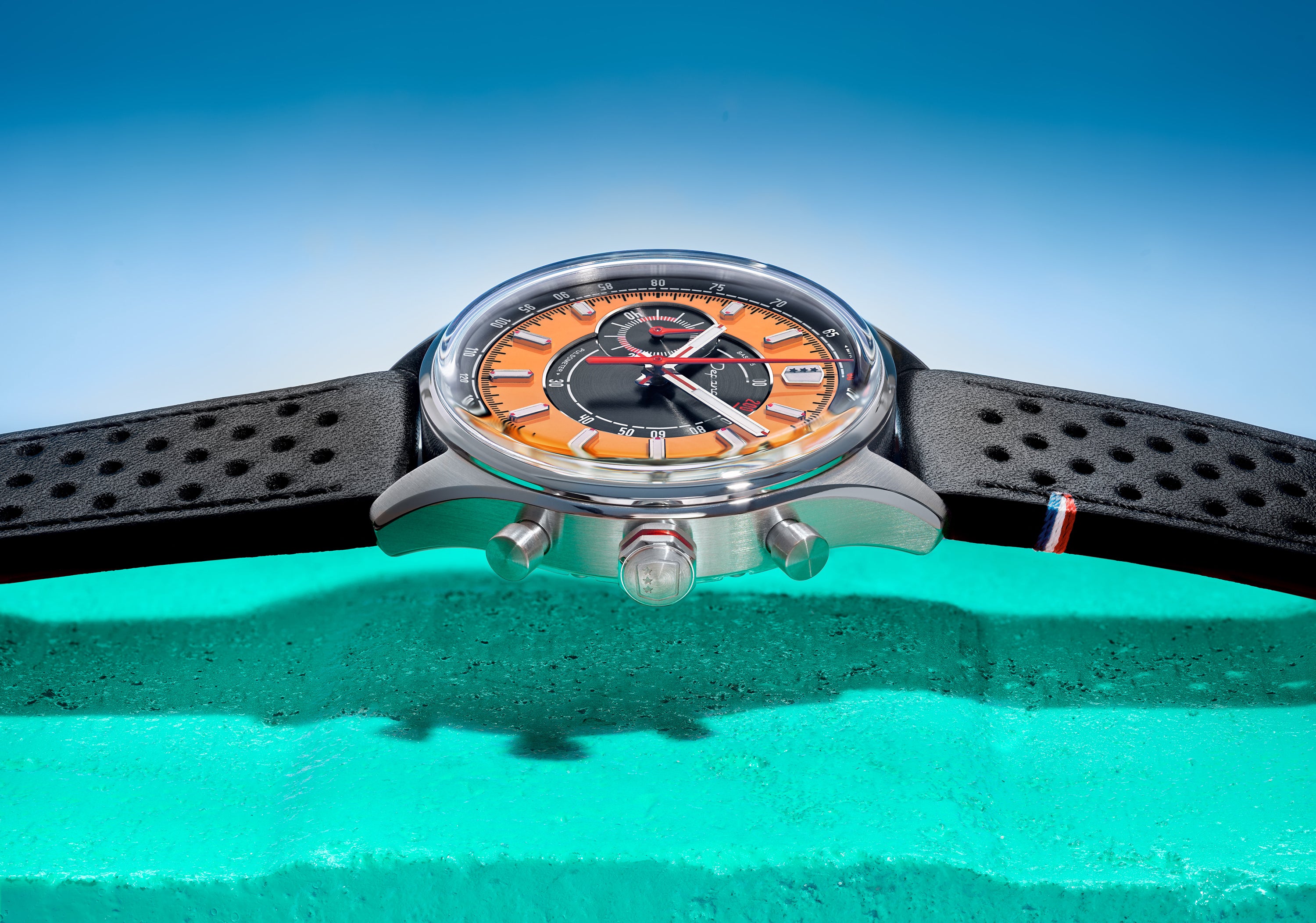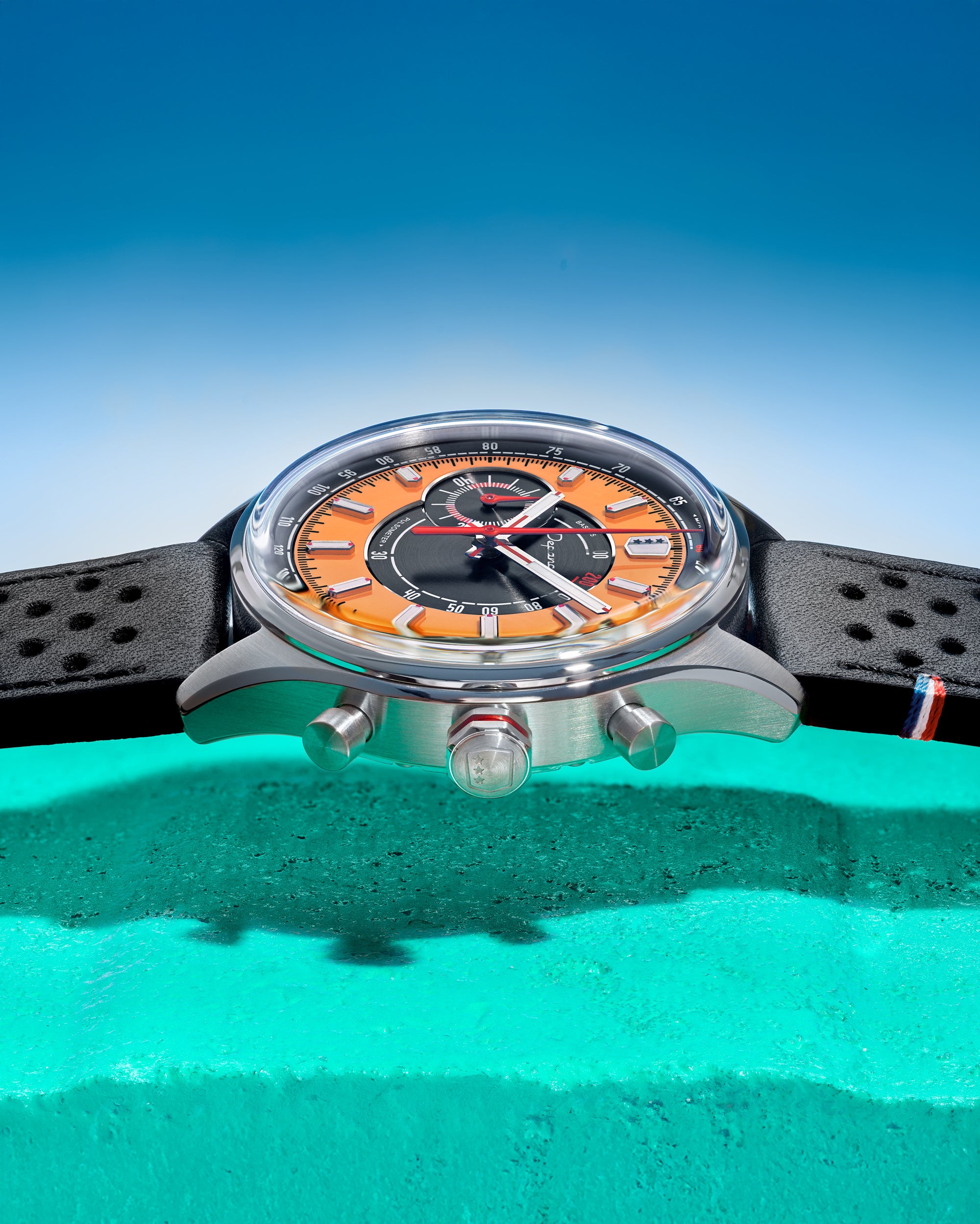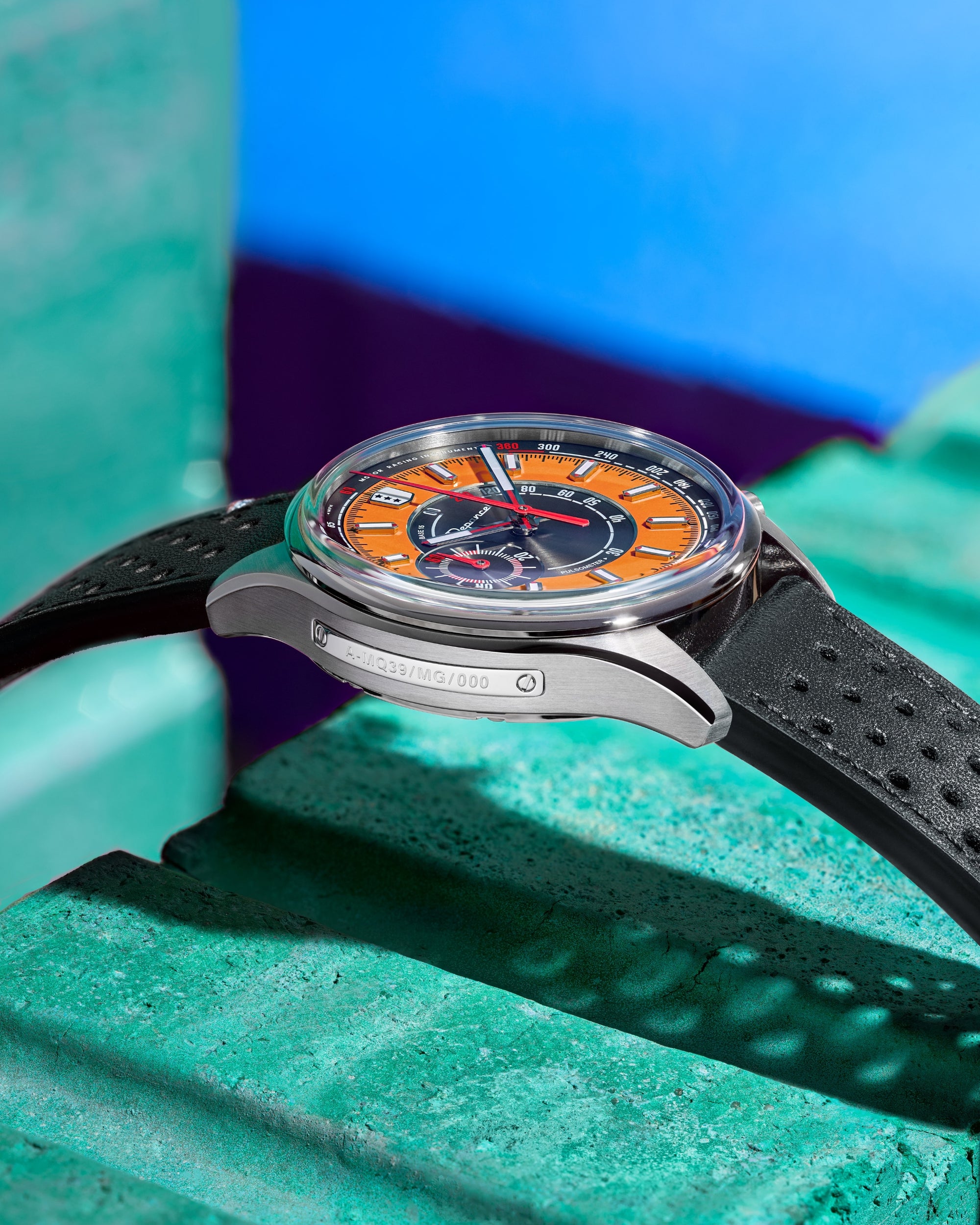 Avec son design frais et lumineux, la Allure Mono Eye propose une vision singulière du chronographe, pensée pour les beaux jours. Son cadran adopte une construction en secteurs : au centre, une surface noire brossée circulairement accueille l’échelle pulsométrique, avec en périphérie un anneau extérieur orange mettant en valeur les index appliqués. Signature du chronographe, son affichage Mono Eye se traduit par un sous-compteur 60 minutes positionné à gauche, à la jonction des deux secteurs. Le réhaut noir brossé circulairement porte l’échelle tachymétrique, tandis que les index et les aiguilles des heures et des minutes, dotés de Super-LumiNova® C1, garantissent une lecture optimale en toutes circonstances.