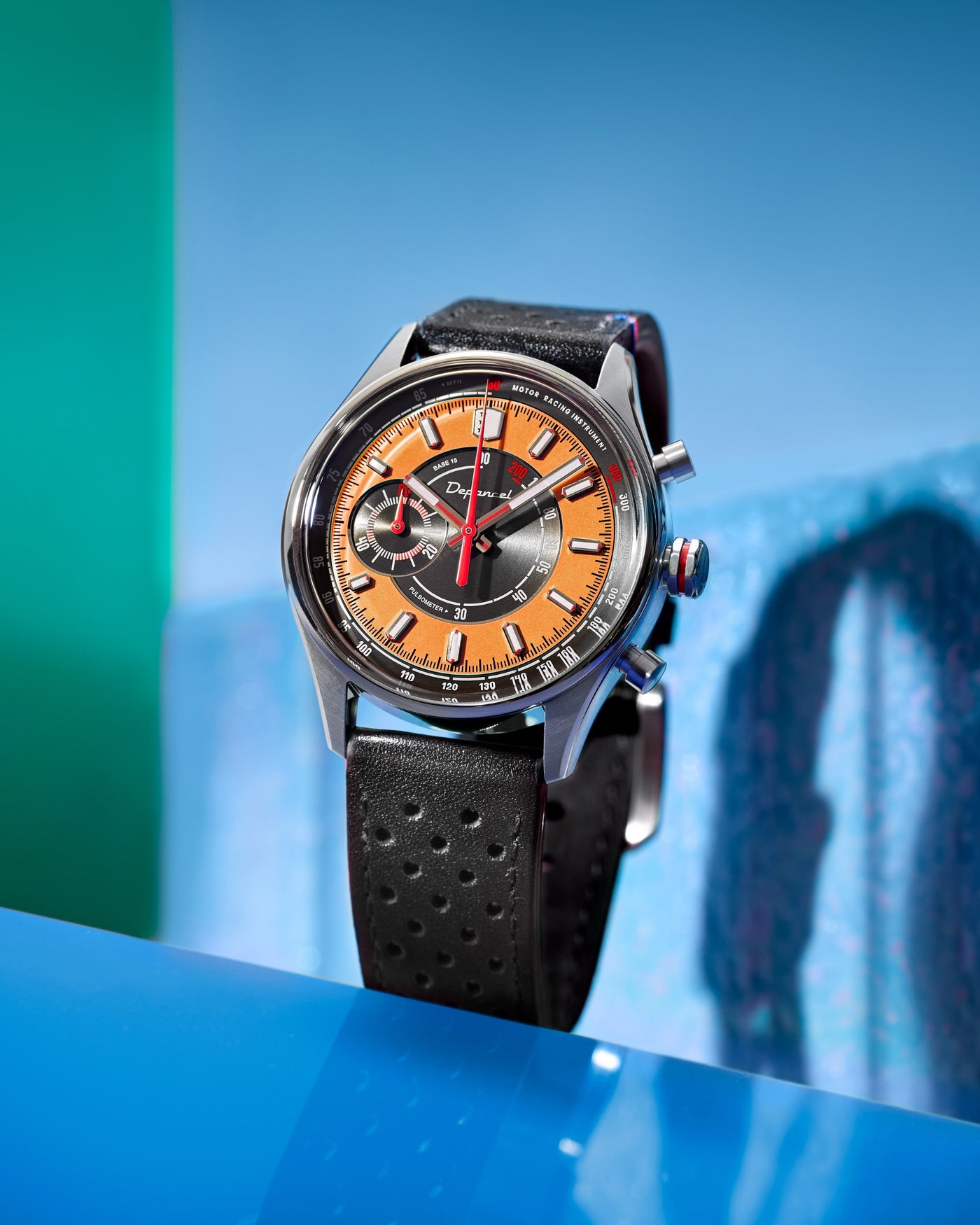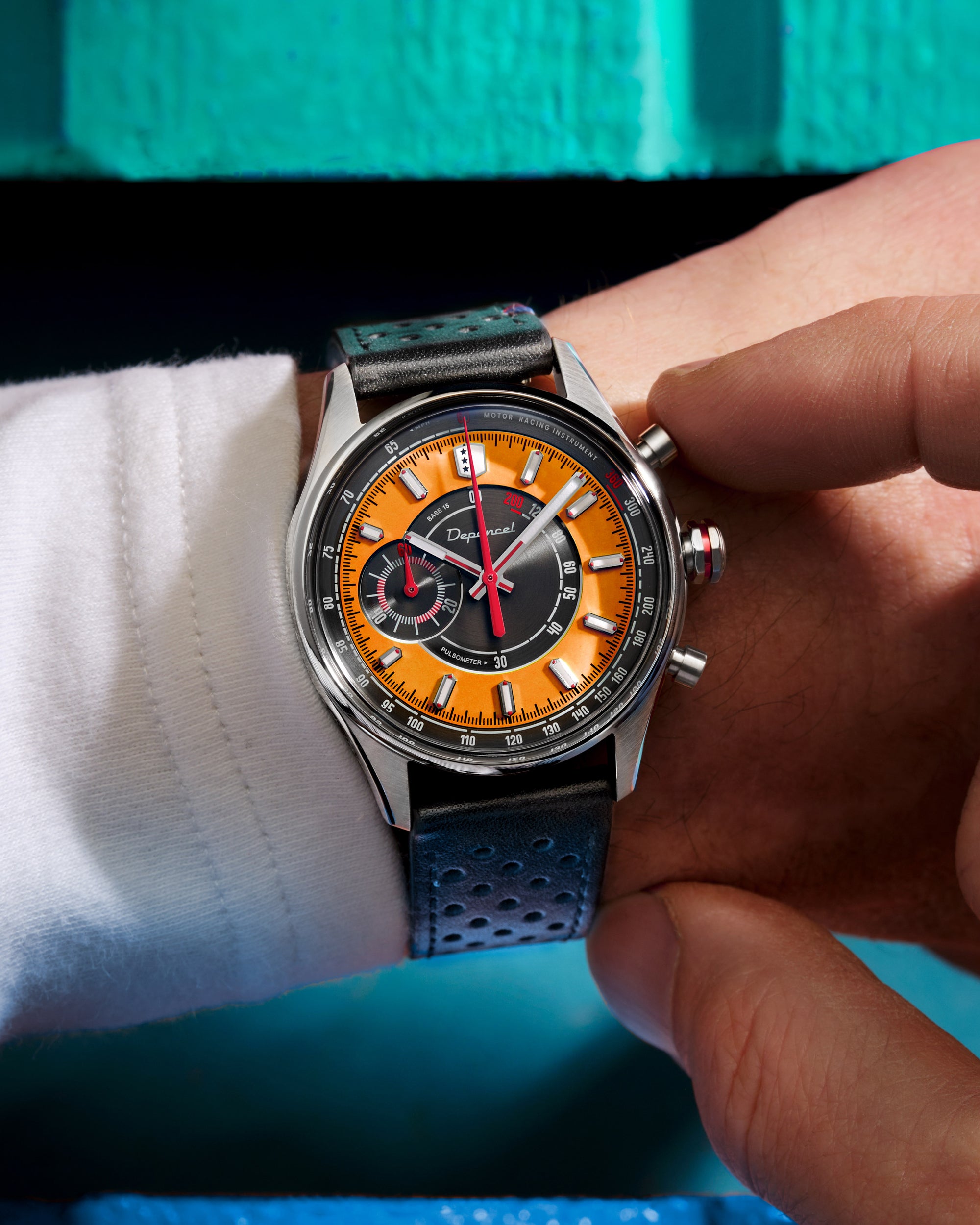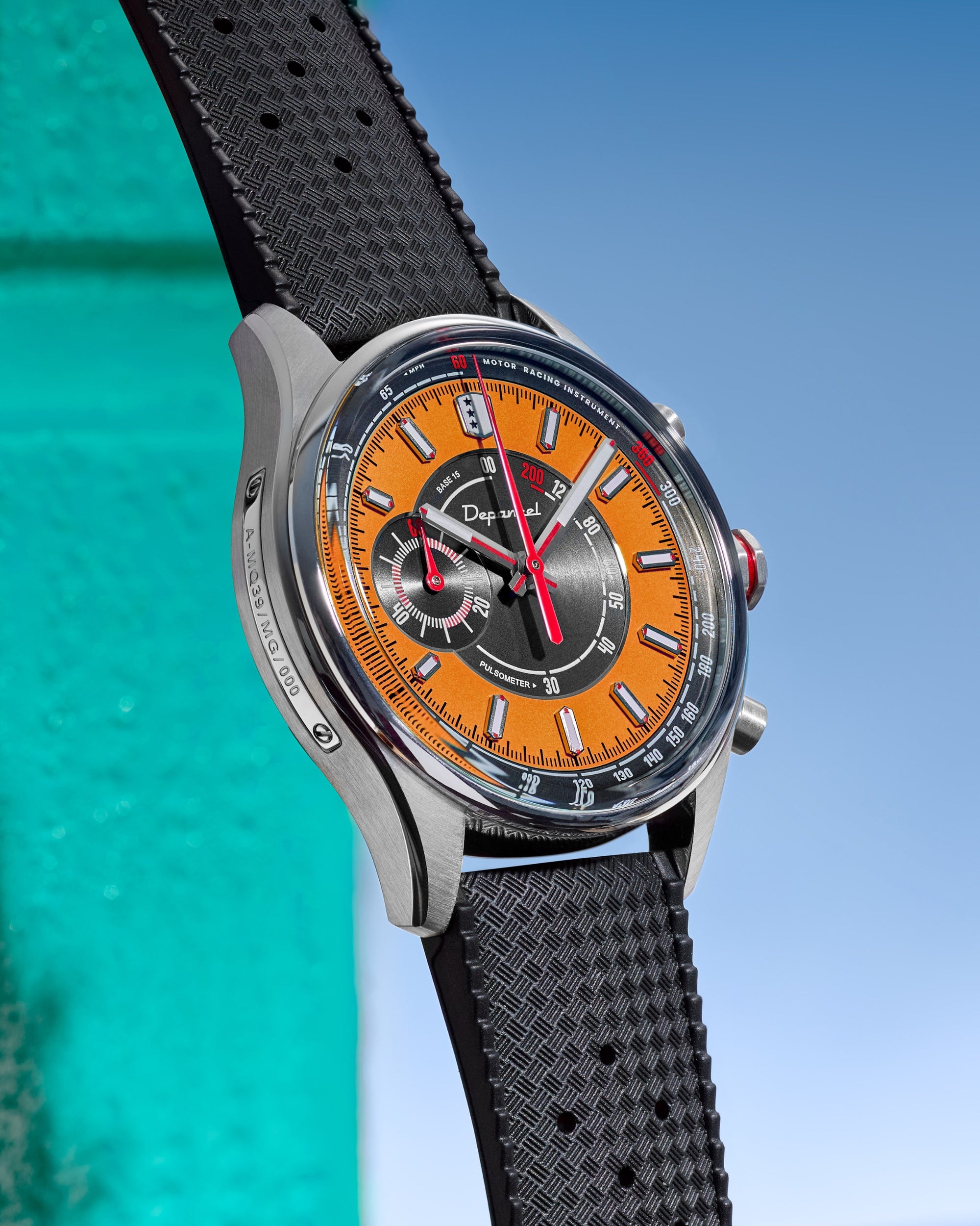 Avec son design frais et lumineux, la Allure Mono Eye propose une vision singulière du chronographe, pensée pour les beaux jours. Son cadran adopte une construction en secteurs : au centre, une surface noire brossée circulairement accueille l’échelle pulsométrique, avec en périphérie un anneau extérieur orange mettant en valeur les index appliqués. Signature du chronographe, son affichage Mono Eye se traduit par un sous-compteur 60 minutes positionné à gauche, à la jonction des deux secteurs. Le réhaut noir brossé circulairement porte l’échelle tachymétrique, tandis que les index et les aiguilles des heures et des minutes, dotés de Super-LumiNova® C1, garantissent une lecture optimale en toutes circonstances.