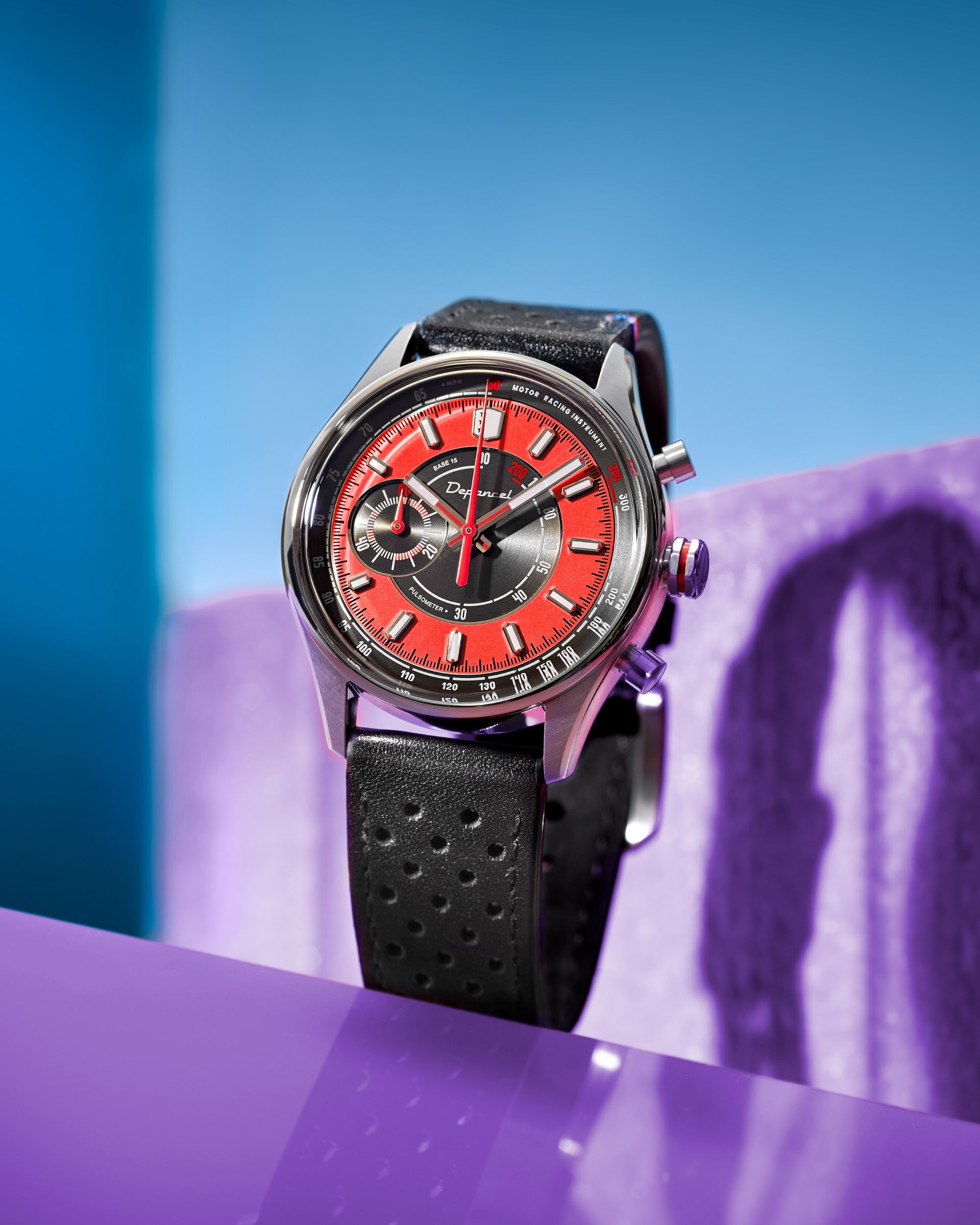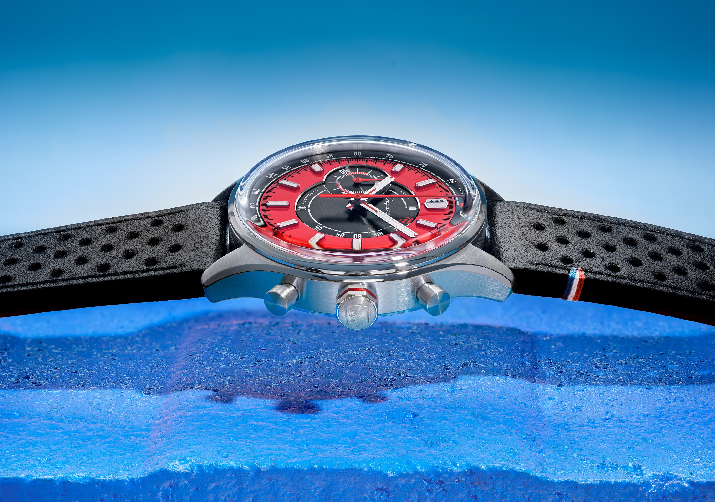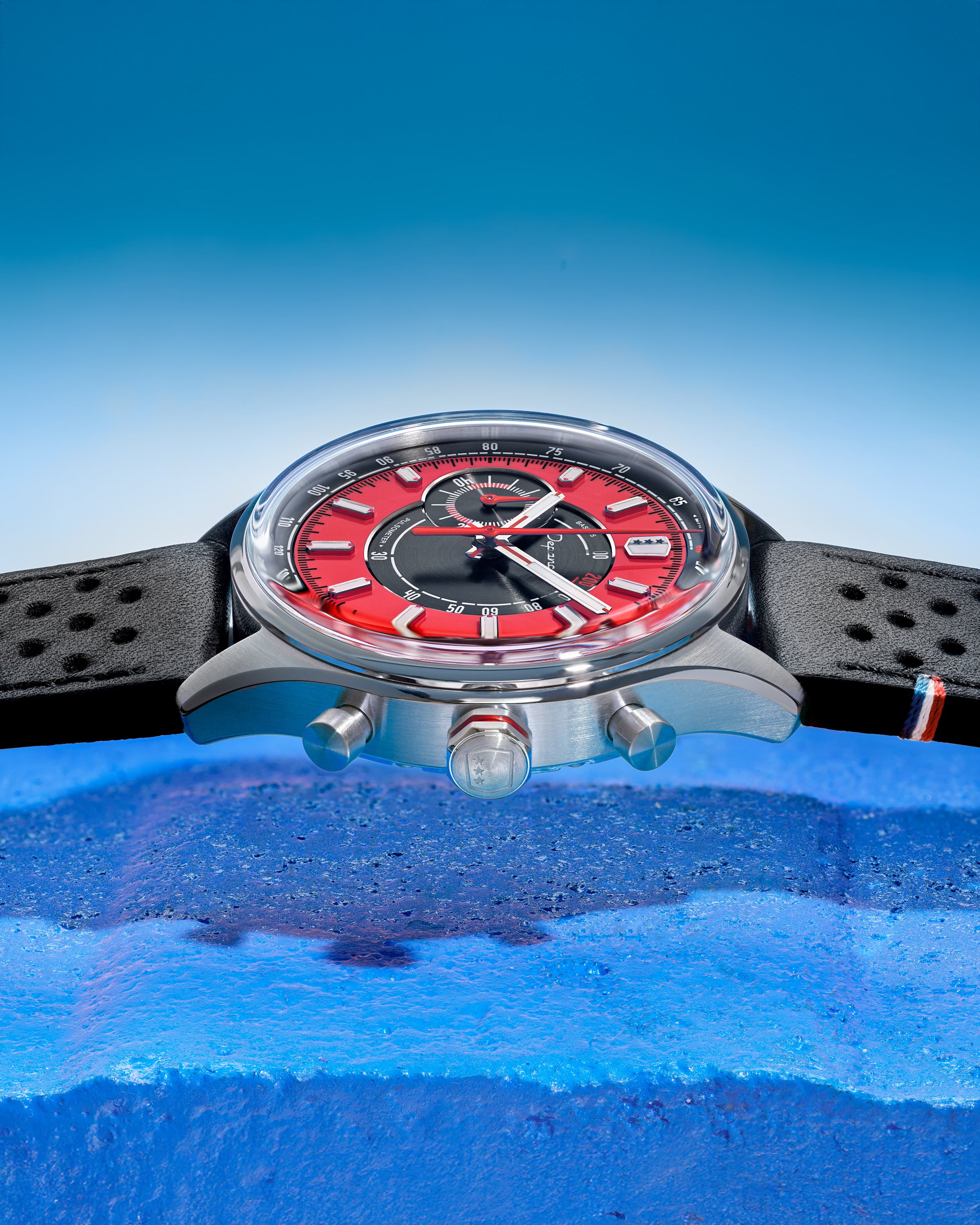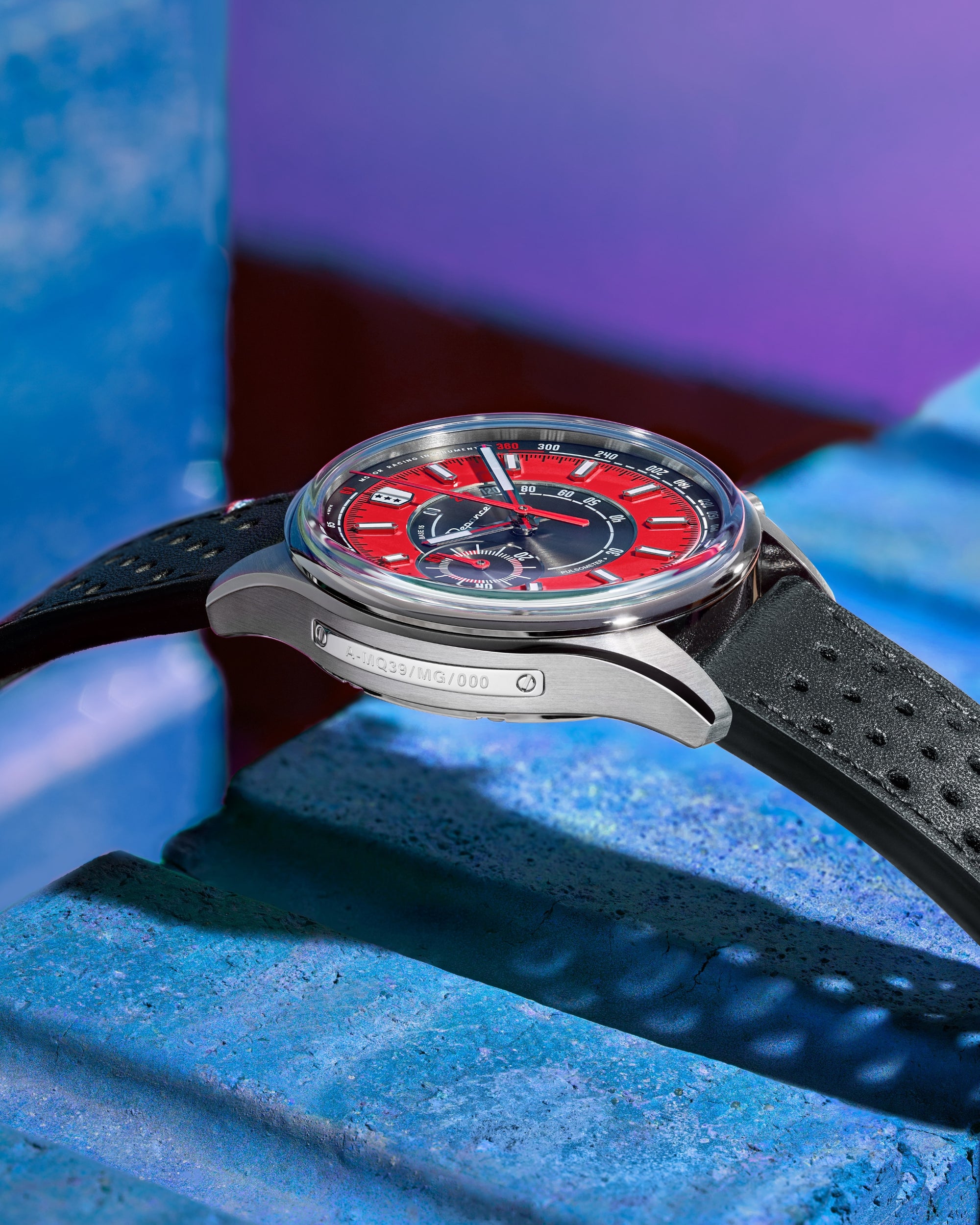 Avec son design frais et lumineux, la Allure Mono Eye propose une vision singulière du chronographe, pensée pour les beaux jours. Son cadran adopte une construction en secteurs : au centre, une surface noire brossée circulairement accueille l’échelle pulsométrique, avec en périphérie un anneau extérieur rouge mettant en valeur les index appliqués. Signature du chronographe, son affichage Mono Eye se traduit par un sous-compteur 60 minutes positionné à gauche, à la jonction des deux secteurs. Le réhaut noir brossé circulairement porte l’échelle tachymétrique, tandis que les index et les aiguilles des heures et des minutes, dotés de Super-LumiNova® C1, garantissent une lecture optimale en toutes circonstances.