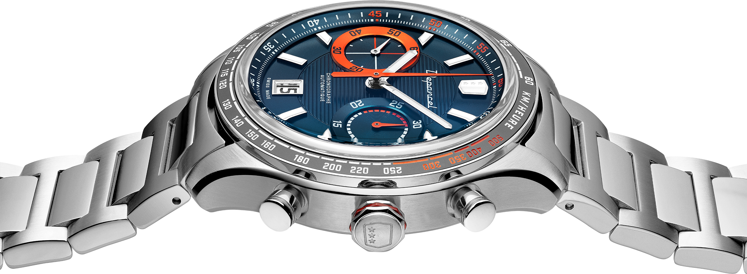 Le bleu foncé intemporel du cadran s’associe à des pointes de rouge pour renforcer l’esprit racing. Des détails couleur orange, qui rappellent le célèbre “Tangerine” des carrosseries Porsche 911 des années 60, mettent l’accent sur les fonctions chronographe et la marche du mouvement. Une montre à la fois élégante et sportive pour tous les amateurs de belle mécanique.