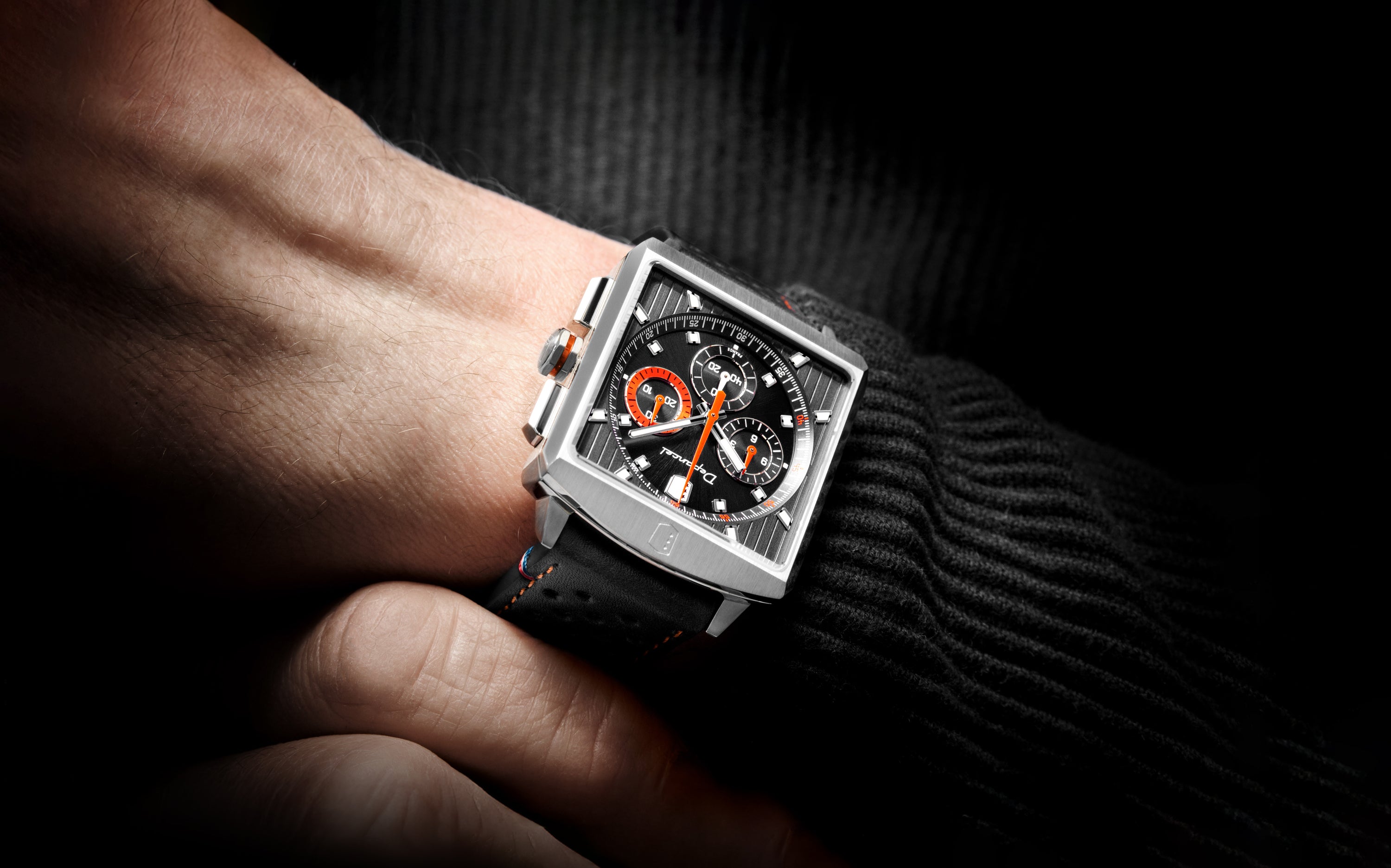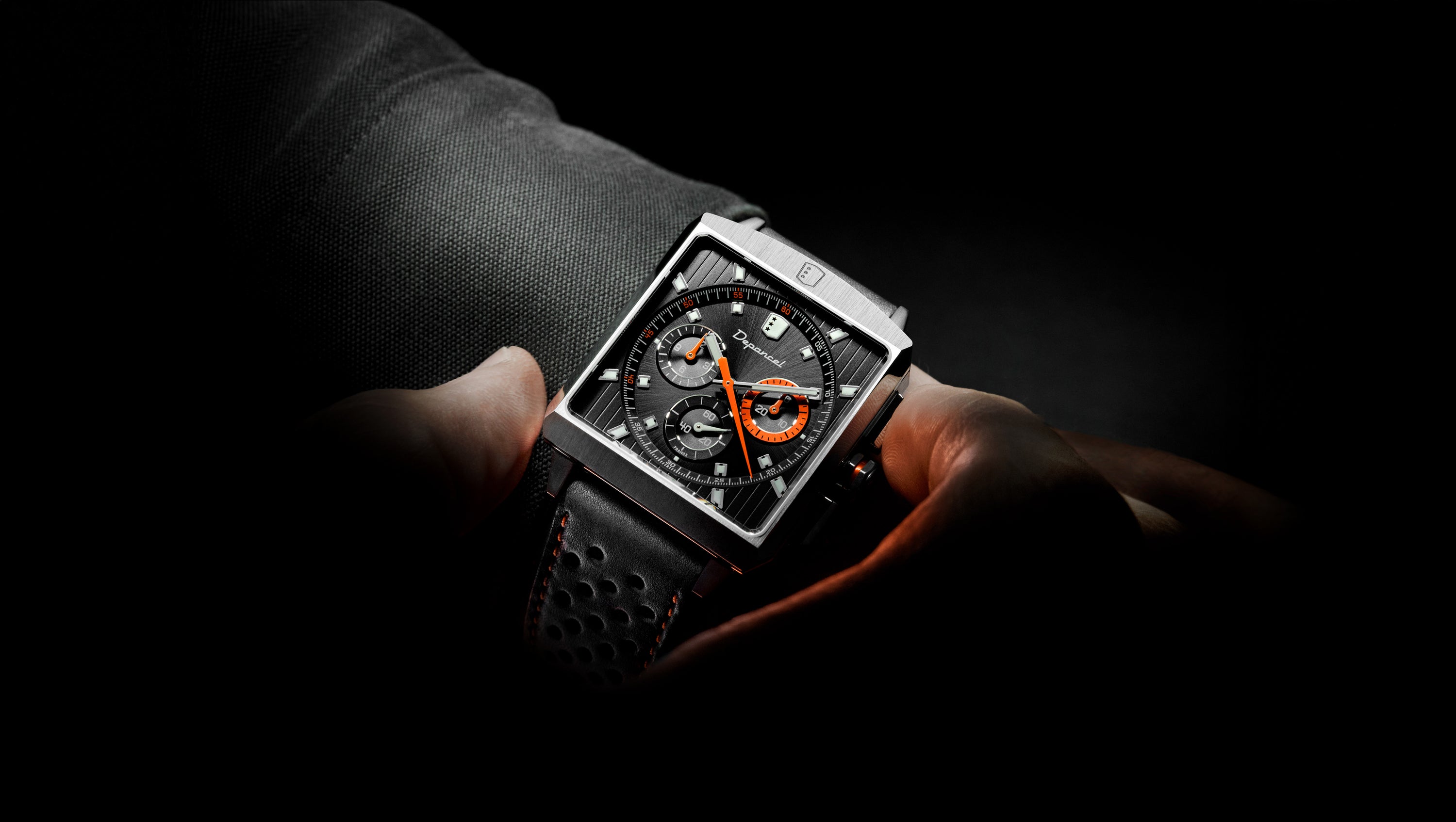 Le cadran de la Série R01 Black Tangerine révèle toute la richesse de notre univers, avec un motif à deux niveaux et des lignes verticales élargies, évoquant les grilles d’aération des voitures de course d’époque. Pour faciliter la lecture, la couleur orange est associée aux indications du chronographe : aiguille centrale des secondes, compteurs des heures à 9h ainsi que celui des minutes à 3h. Les aiguilles « Depancel Dashboard », inspirées des compteurs de tableau de bord et les index, semblables à des marqueurs de piste, sont pourvus de Super-LumiNova® C1 et assurent une lisibilité parfaite en toutes circonstances.